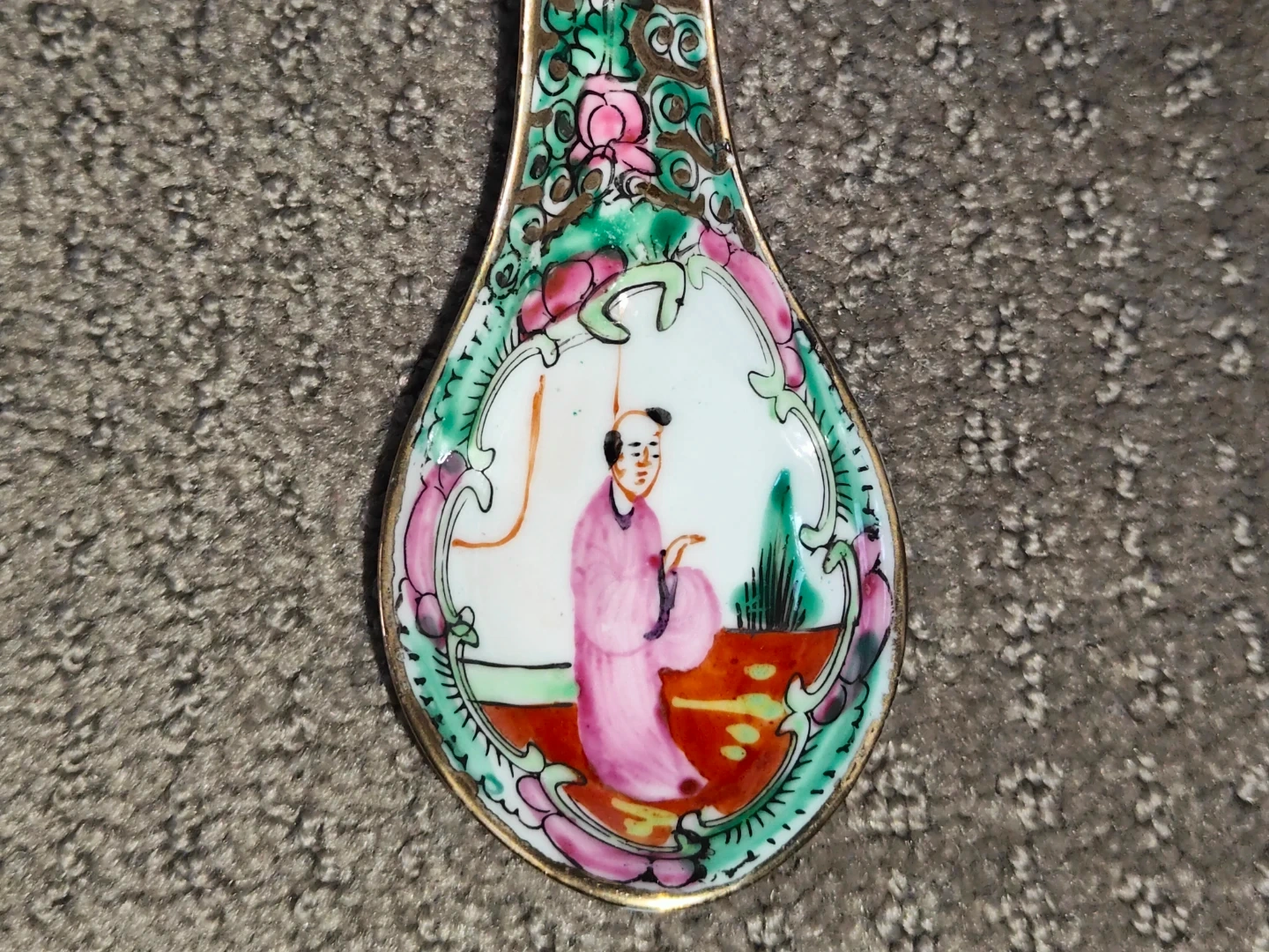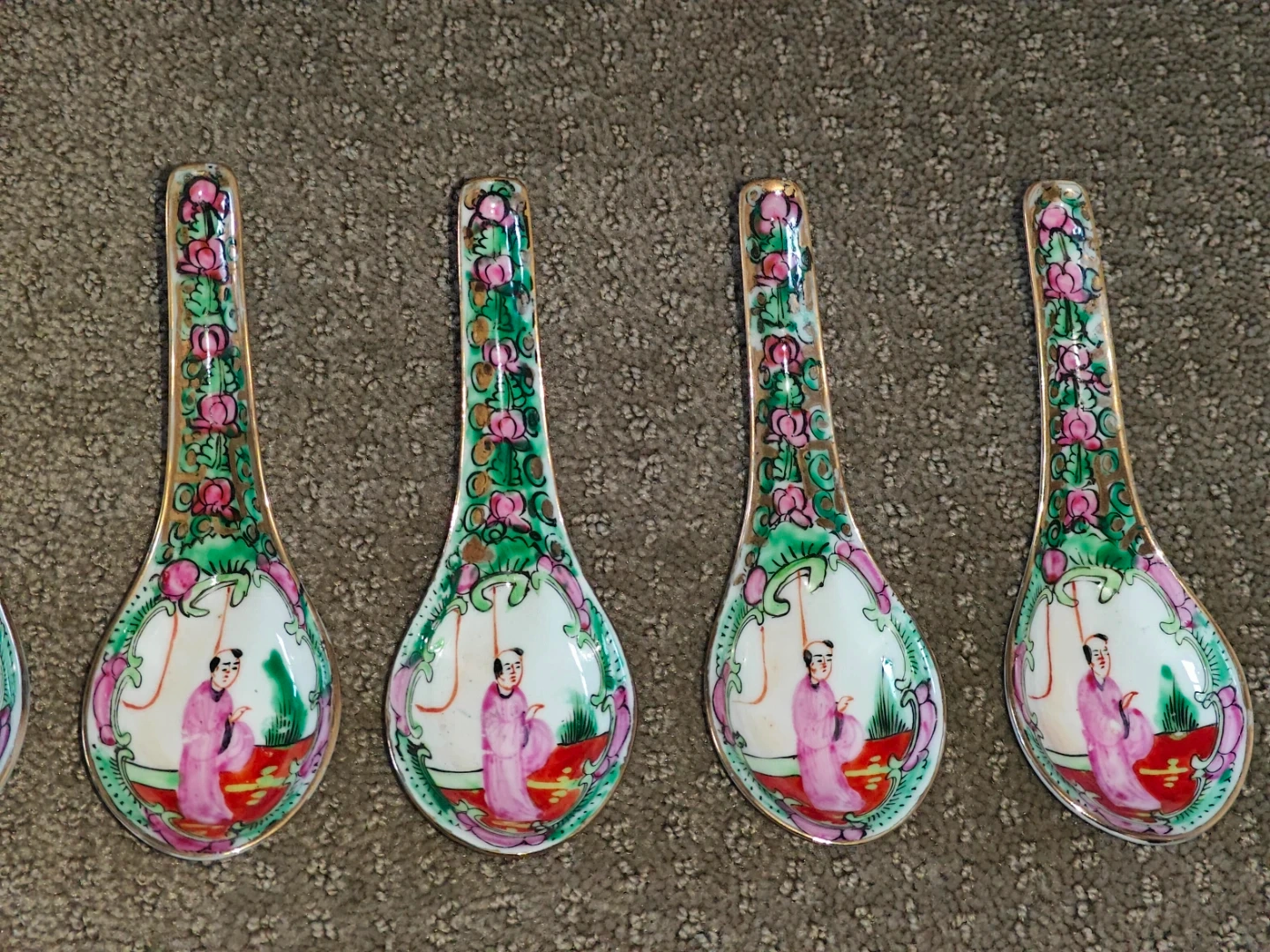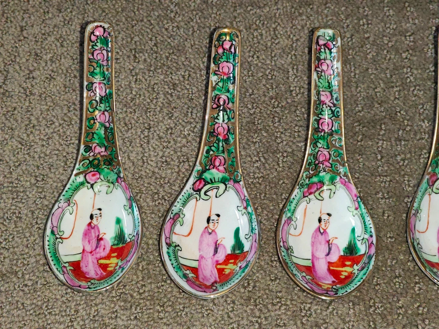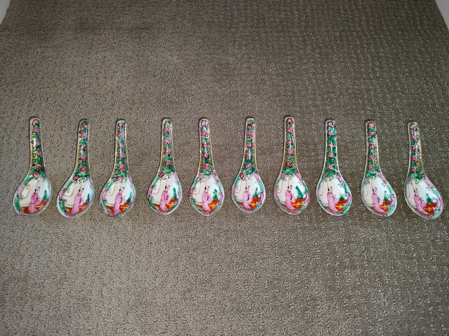 I am selling a Set of 10 Rare Set of 10 Vintage Chinese Asian Rose Medallion Famille Porcelain Spoons - Hand-Painted with Gold Gilt Small Soup Spoon in new condition. Never been used and no chips or cracks on the spoon. Elevate your dining experience or porcelain collection with this exquisite set of 10 vintage Chinese Rose Medallion soup spoons. This is a rare find—a complete set in new, unused condition. There are absolutely no chips or cracks on any of the spoons, and the vibrant colors and gold gilt are as rich as the day they were made.