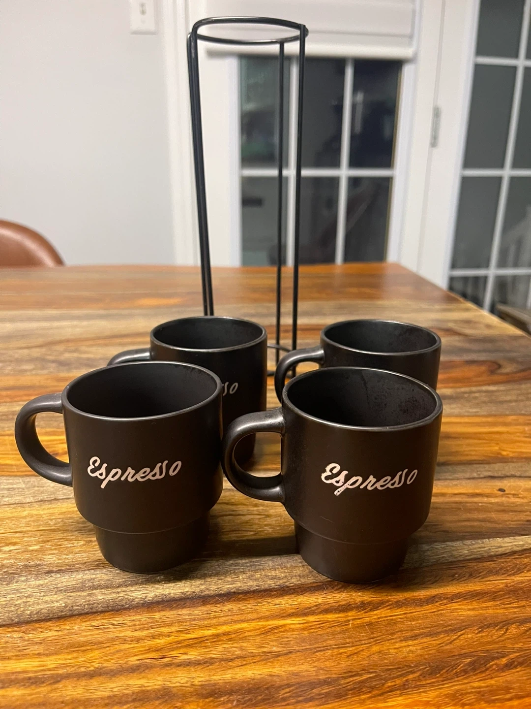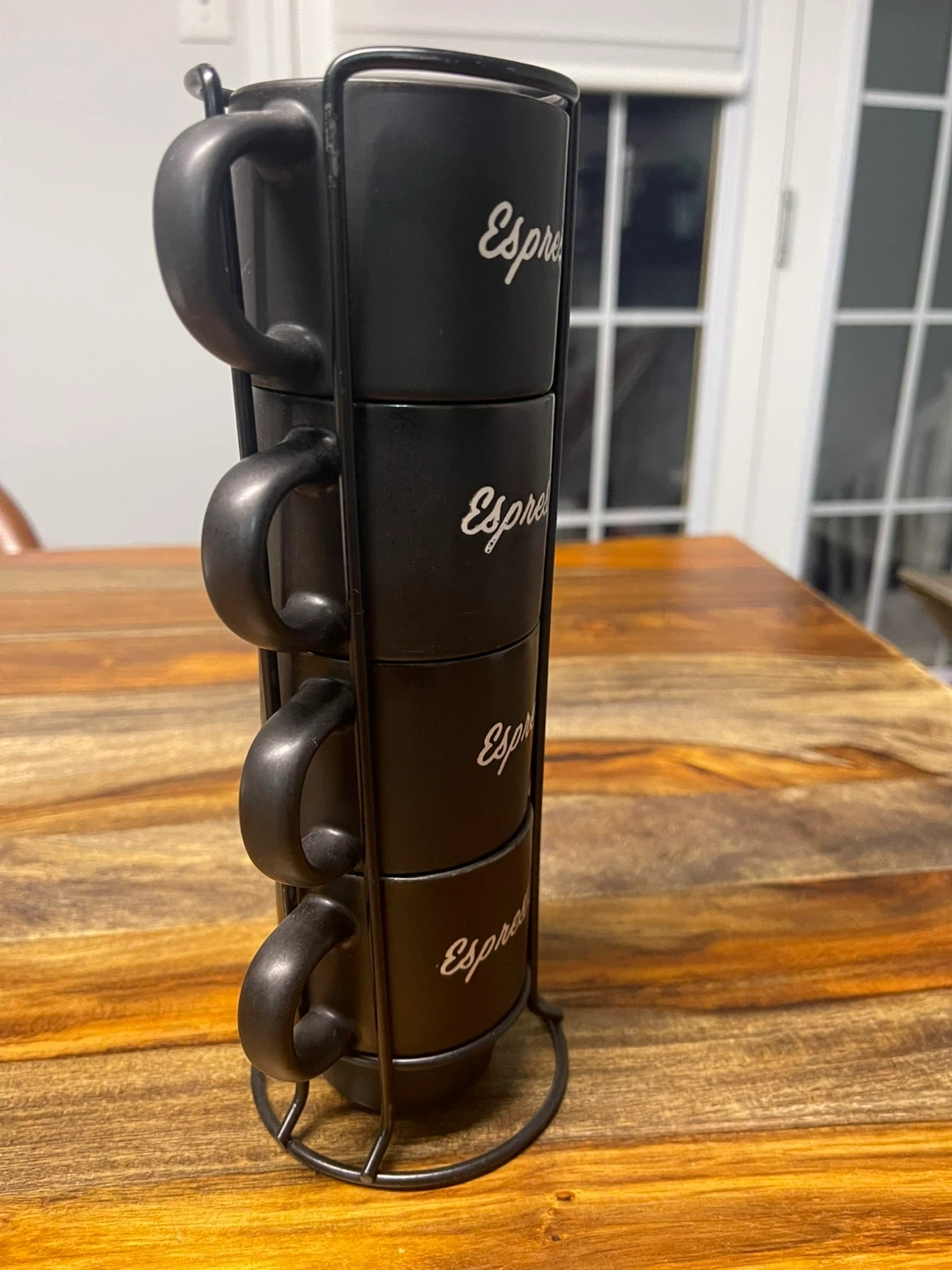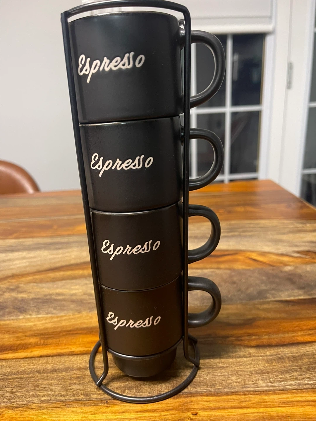 This is a set of four black espresso cups, each labelled "Espresso" in a white, script font. They come with a black metal stand that holds them stacked. The cups are ceramic and are designed for espresso.