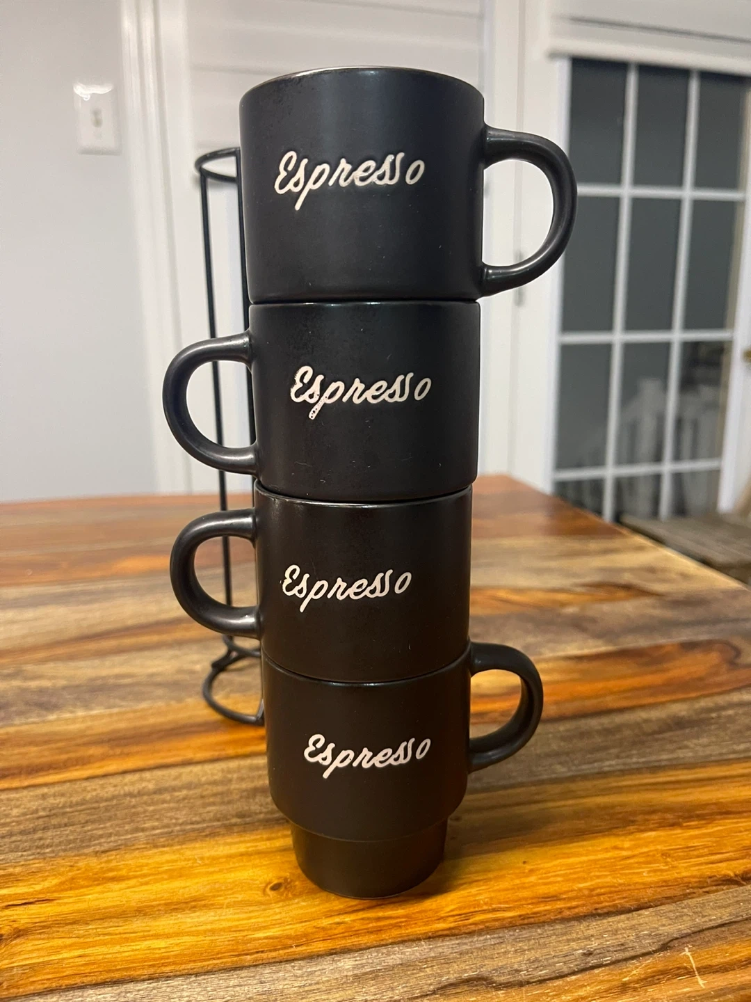 This is a set of four black espresso cups, each labelled "Espresso" in a white, script font. They come with a black metal stand that holds them stacked. The cups are ceramic and are designed for espresso.
