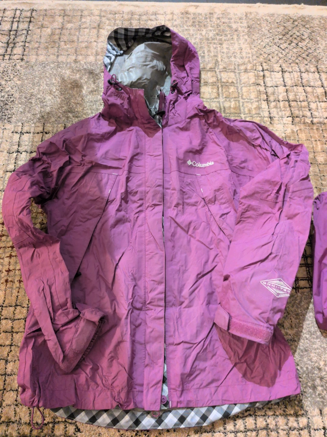 This Columbia jacket is waterproof and breathable, perfect for outdoor adventures! It features a hood and a durable, lightweight design. Zippered front closure and adjustable cuffs.