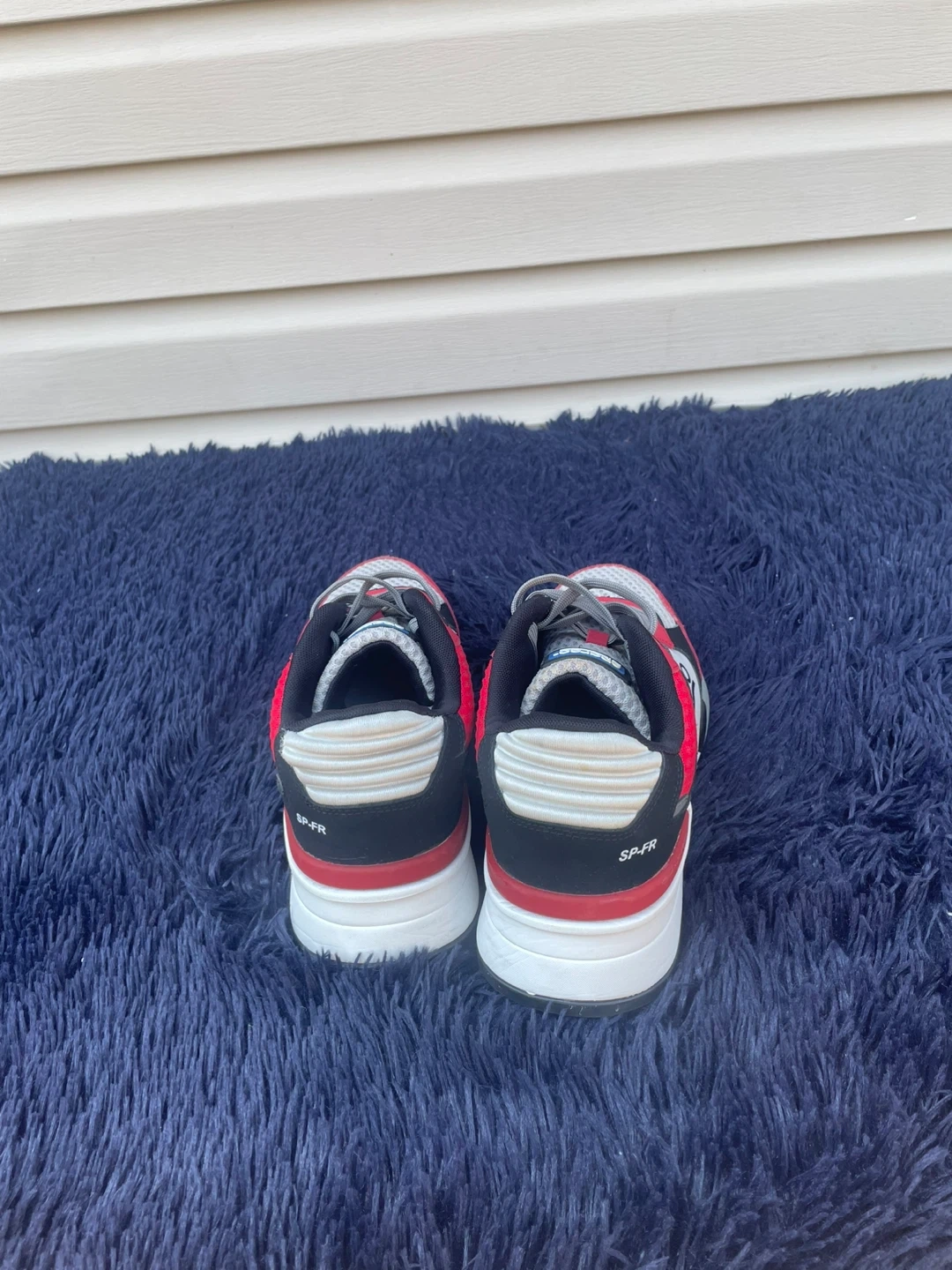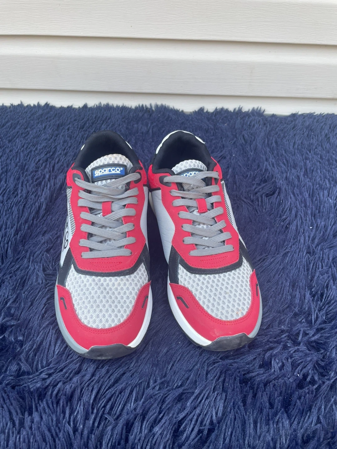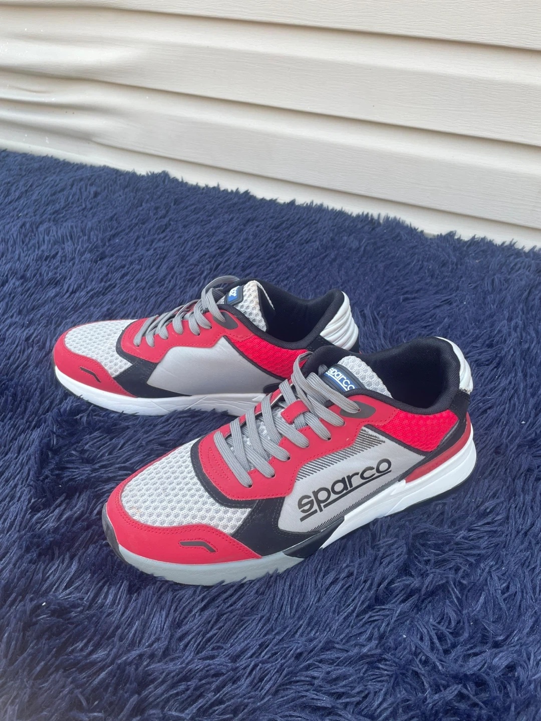 Sparco athletic shoes in red, grey, and black. These kicks feature a breathable mesh upper and lace-up closure. Comfortable for everyday wear!