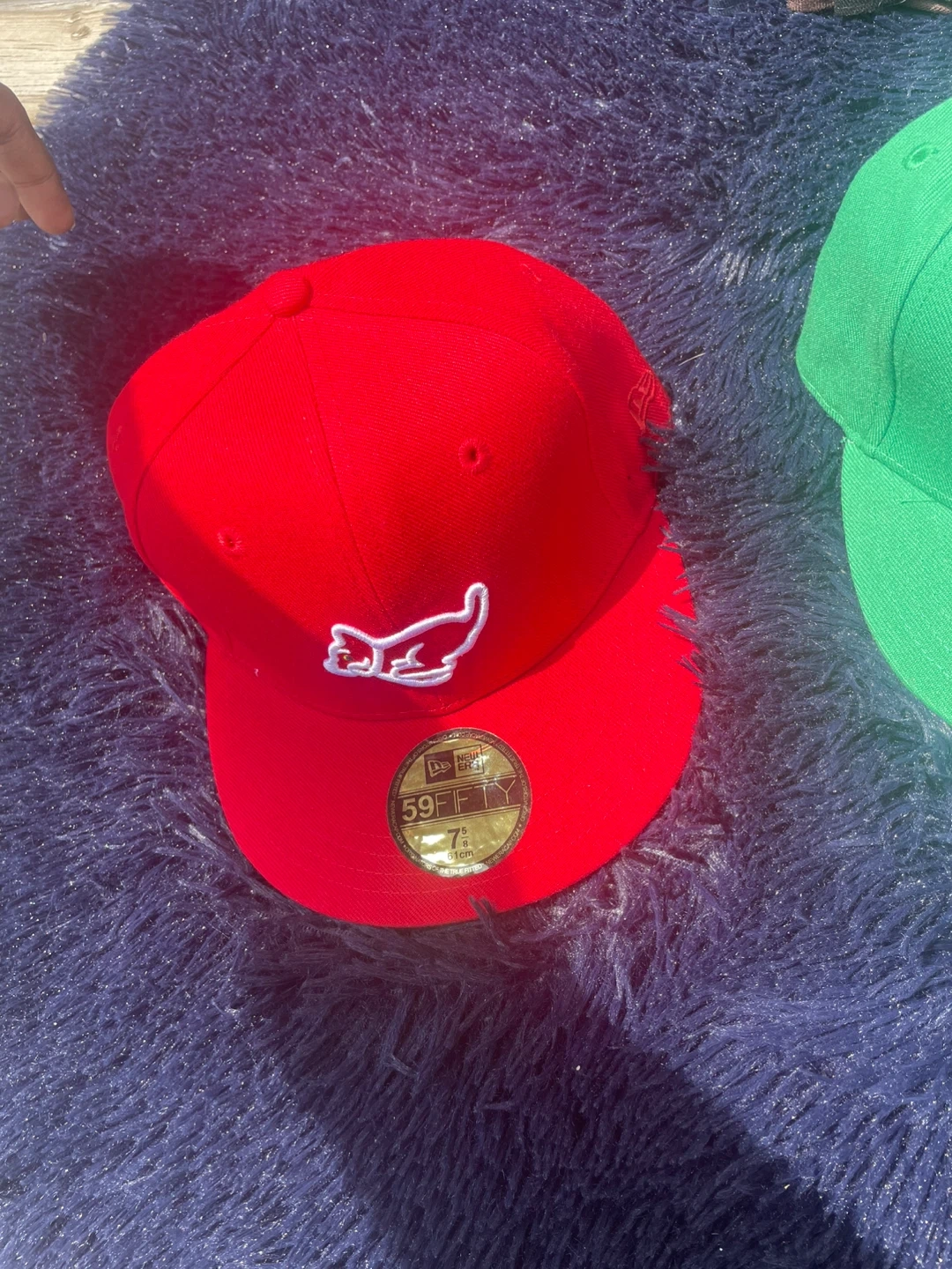 Selling a collection of New Era 59FIFTY fitted hats. Includes various styles and colours like green, brown with "BABYMILO STORE" text, and navy with "BAPE" logo. The green hat has a red skull design. Most hats appear to be size 7 1/4 or 7 1/2. Great for hat enthusiasts!
