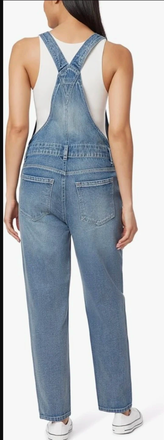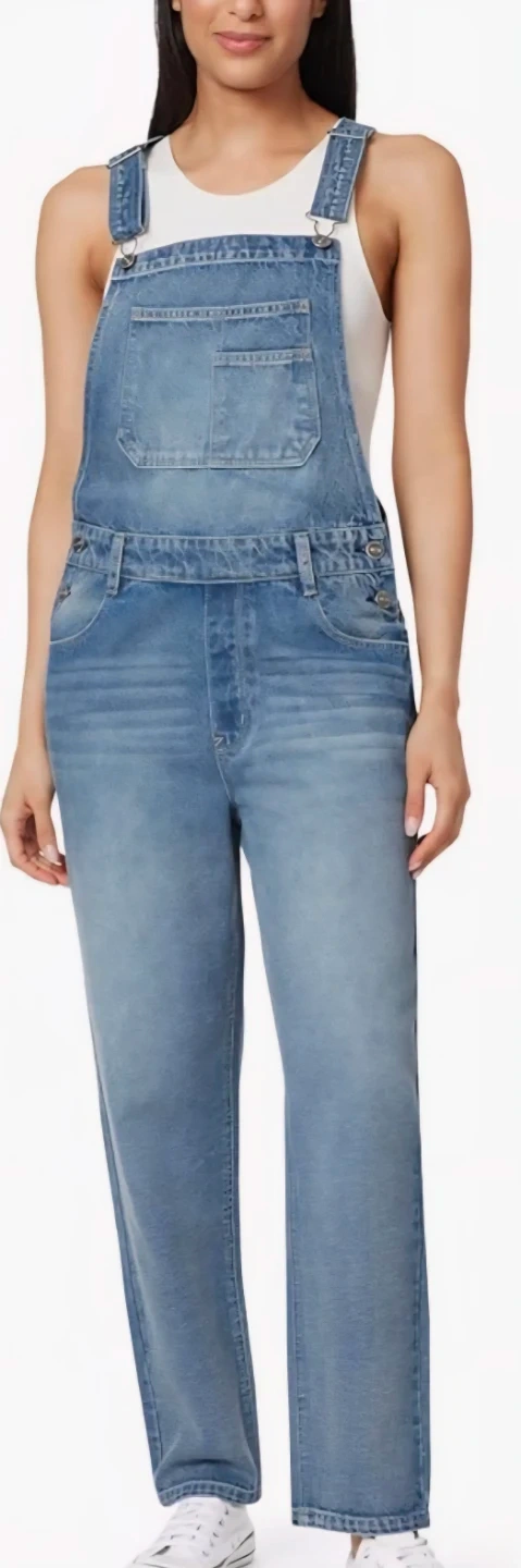 Women's light wash denim overalls. New Fit, The Girlfriend Straight Overalls. These feature adjustable straps and a classic bib front. Made from comfortable 100% cotton denim.