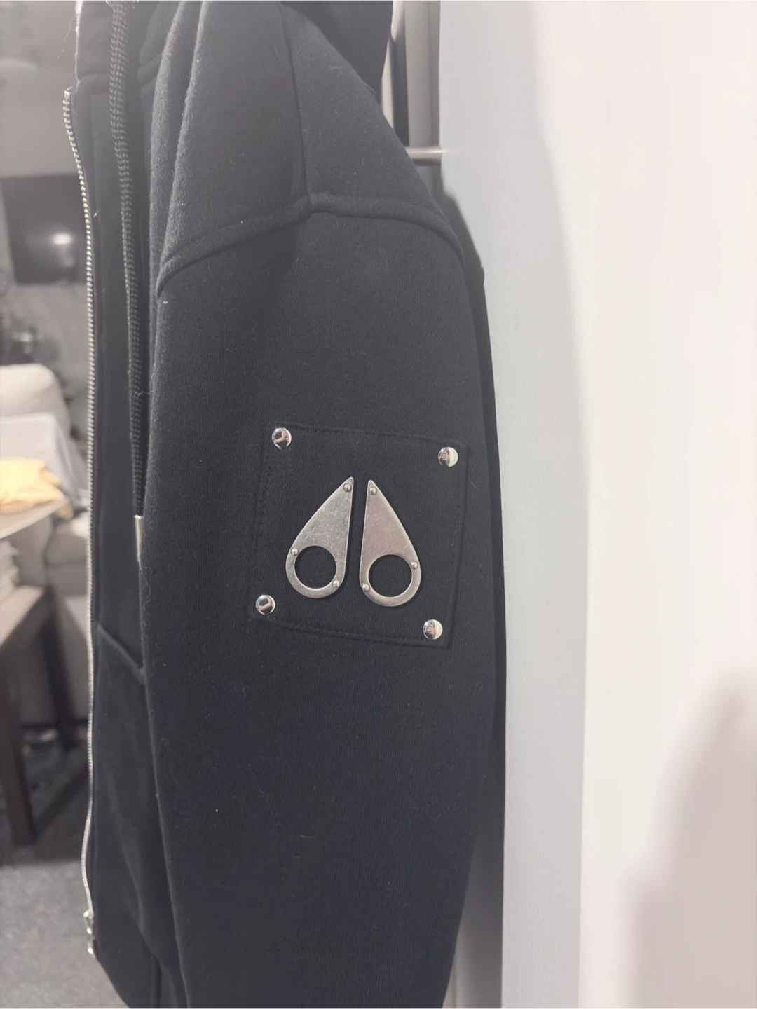 Cozy black Moose Knuckles hoodie with a plush white fur lining. It features the iconic Moose Knuckles logo on the chest and a comfortable zip-up design. This jacket is perfect for staying warm during cooler weather.