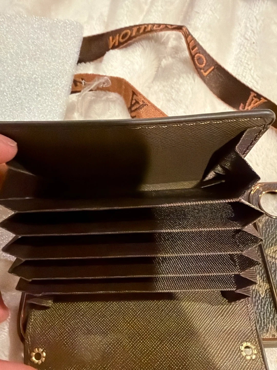 Designer iPhone 17 pro max phone case with Louis Vuitton Paris branding. Features multiple card slots and an included lanyard guitar strap strap. Brown monogram pattern.