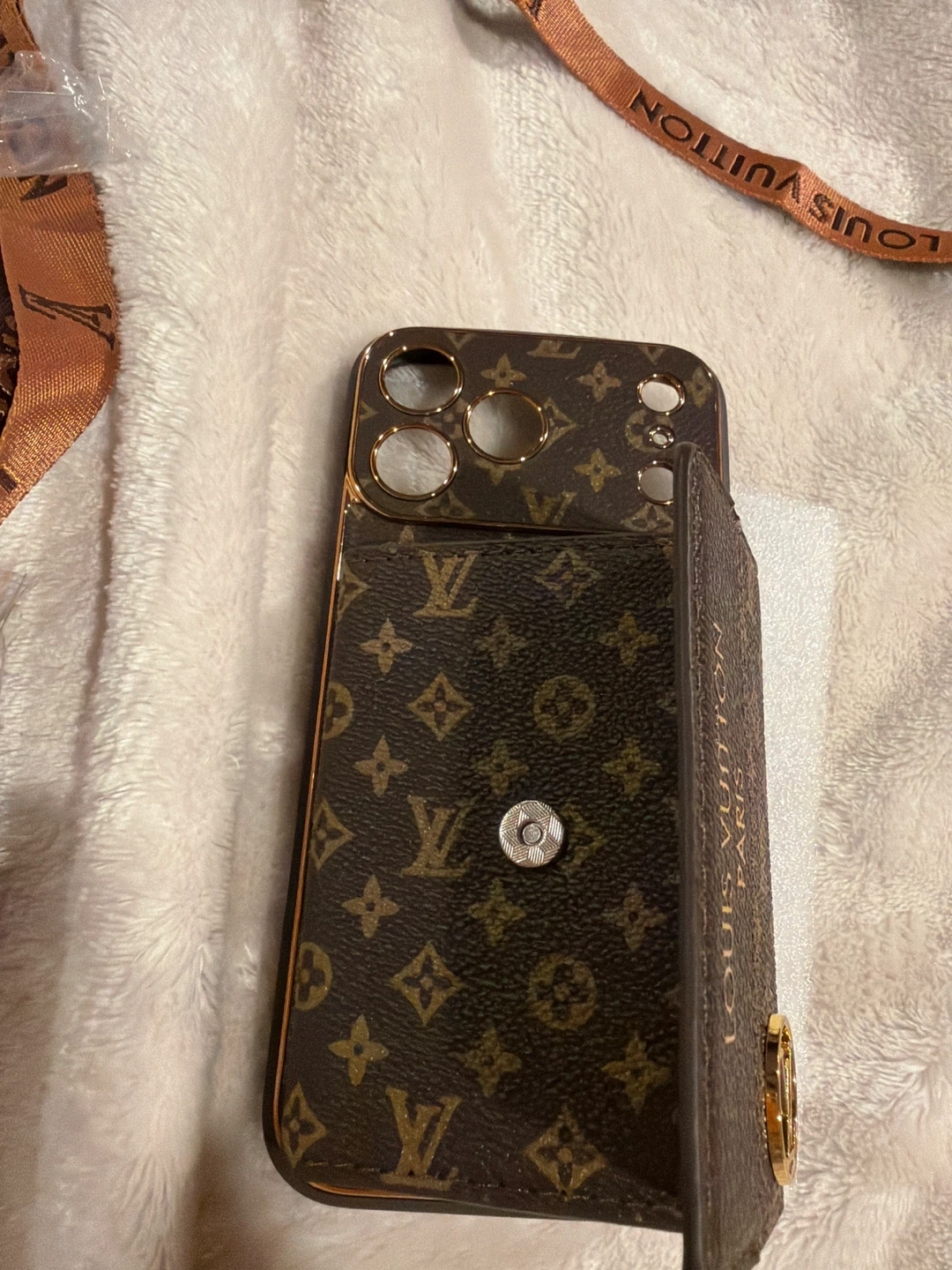 Designer iPhone 17 pro max phone case with Louis Vuitton Paris branding. Features multiple card slots and an included lanyard guitar strap strap. Brown monogram pattern.