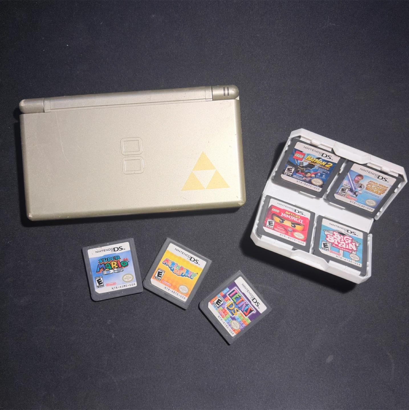 Gold Nintendo DS Lite console. Includes the following games: Super Mario, Mario Kart 2, Lego Ninjago, and Big Brain Academy. It's great for gaming on the go!