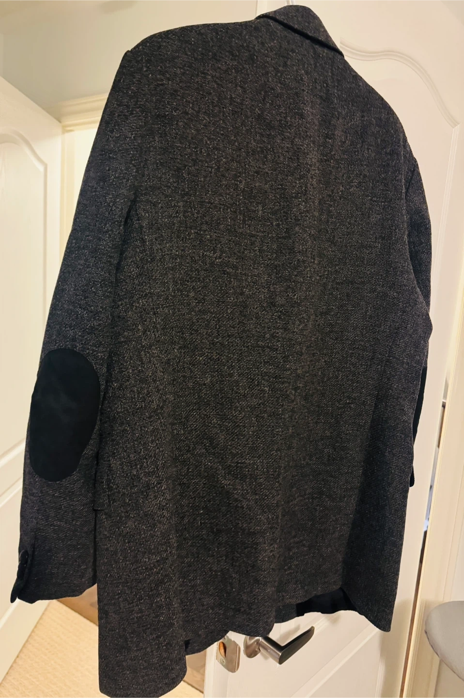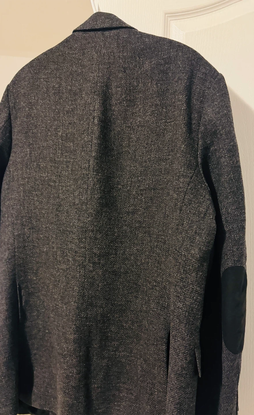 A stylish men's “Burberry” blazer in a dark grey tweed-like fabric. It features contrasting black suede elbow patches for added detail. This jacket has a classic two-button closure and multiple pockets. It's a versatile piece for smart casual occasions.
