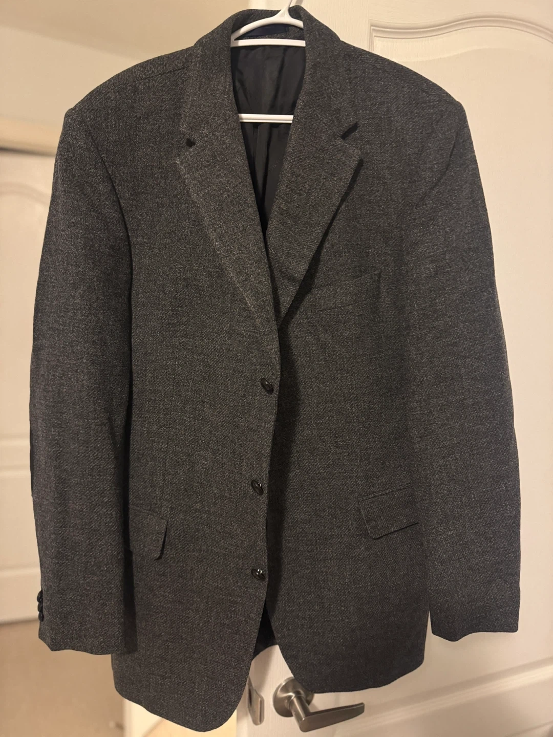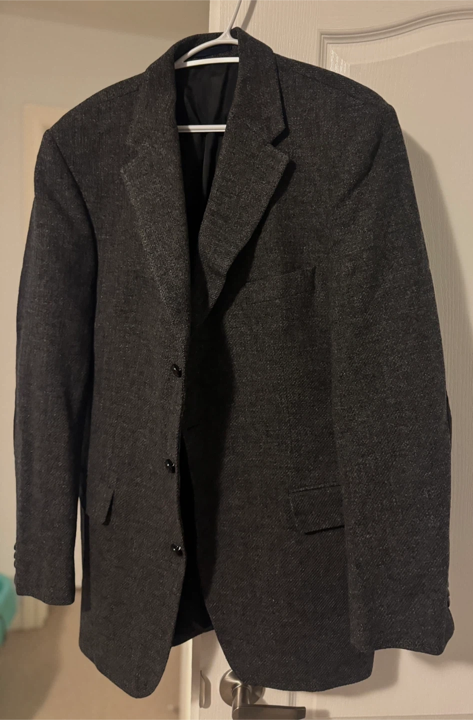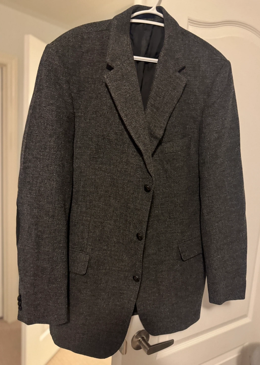 A stylish men's “Burberry” blazer in a dark grey tweed-like fabric. It features contrasting black suede elbow patches for added detail. This jacket has a classic two-button closure and multiple pockets. It's a versatile piece for smart casual occasions.