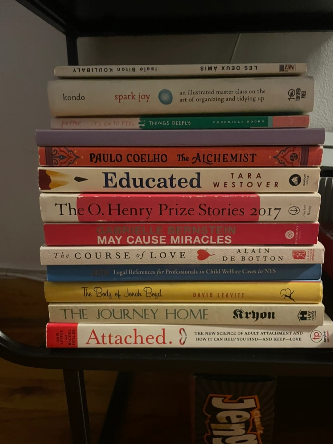 This bundle includes a variety of paperback books. Titles include 'Spark Joy' by Marie Kondo, 'The Alchemist' by Paulo Coelho, 'Educated' by Tara Westover, and 'Attached' by Amir Levine and Rachel S.F. Heller. Also present are 'The O. Henry Prize Stories 2017', 'May Cause Miracles', 'The Course of Love', 'The Journey Home', and 'The Body of Jonah Boyd'. One book is titled '2019 Legal References for Professionals in Child Welfare Cases in NYS'.
