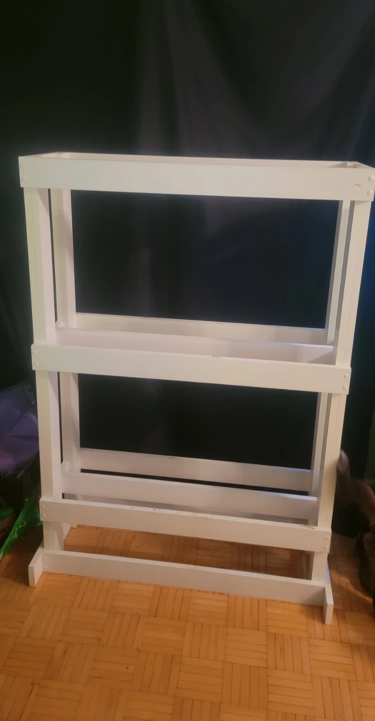 White, Solid wood stand. Super durable. Can be used for either plants or even tanks (fish or small reptiles). Some small blemishes from use but can be easily painted over. Extremely heavy. Can help bring down from our apartment. Please bring a truck or a van to transport.