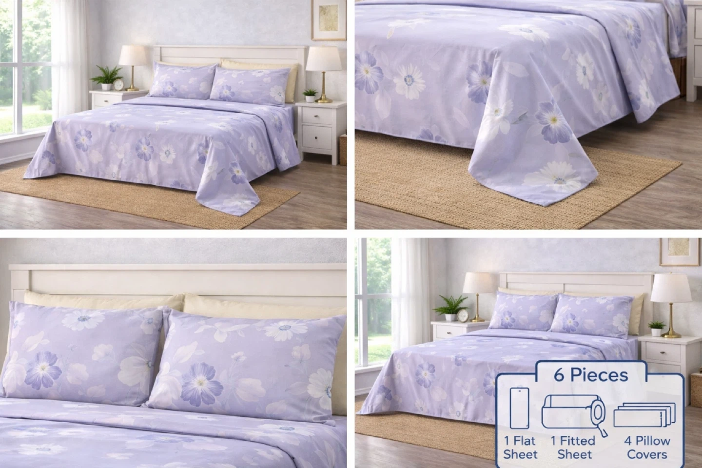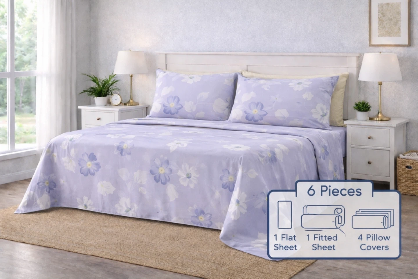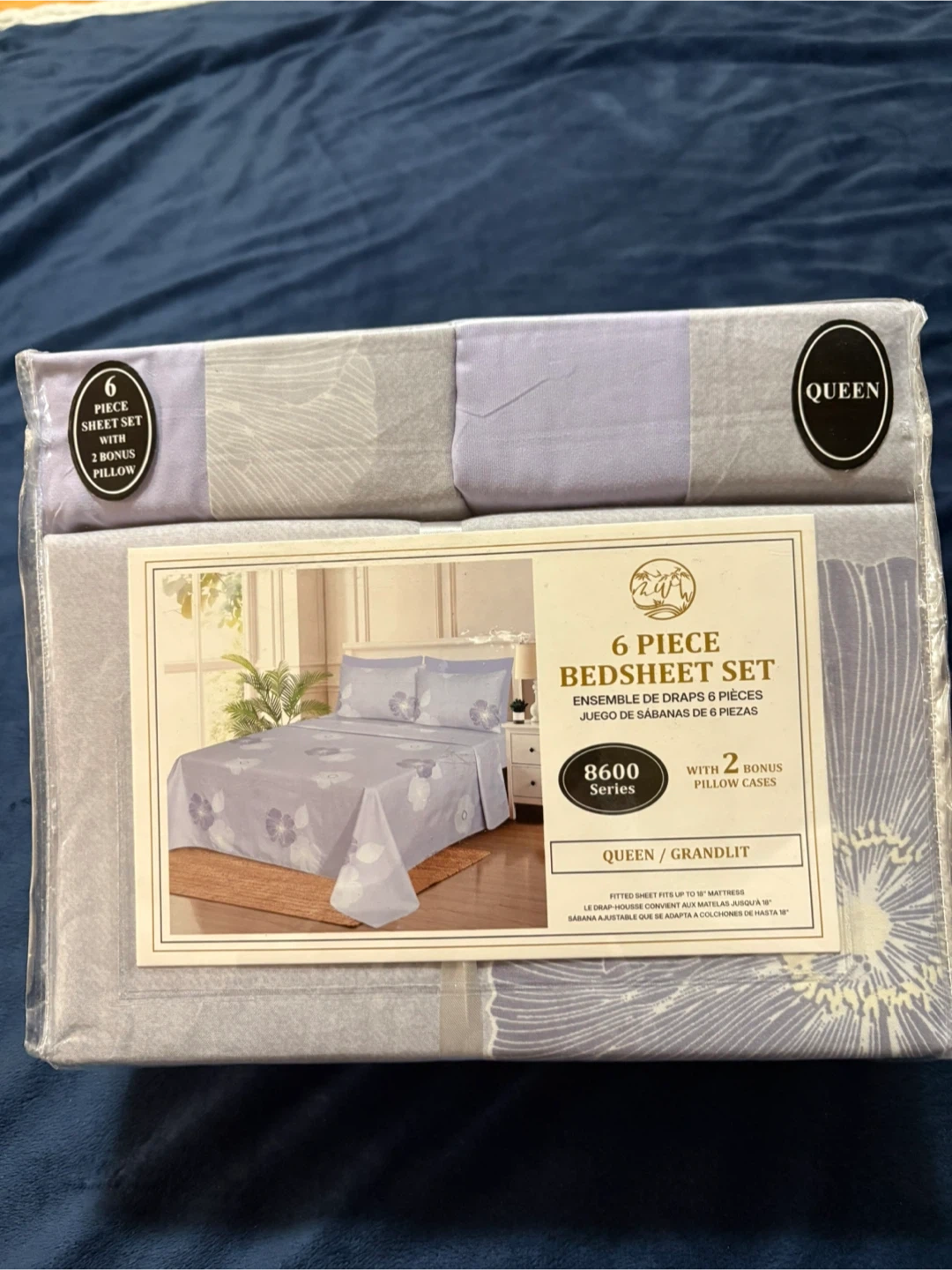 This Brand New 6-piece queen size bedsheet set includes 1 flat sheet, 1 fitted sheet, and 4 pillow covers. It's designed to fit mattresses up to 16" deep. The set features a lovely floral pattern.