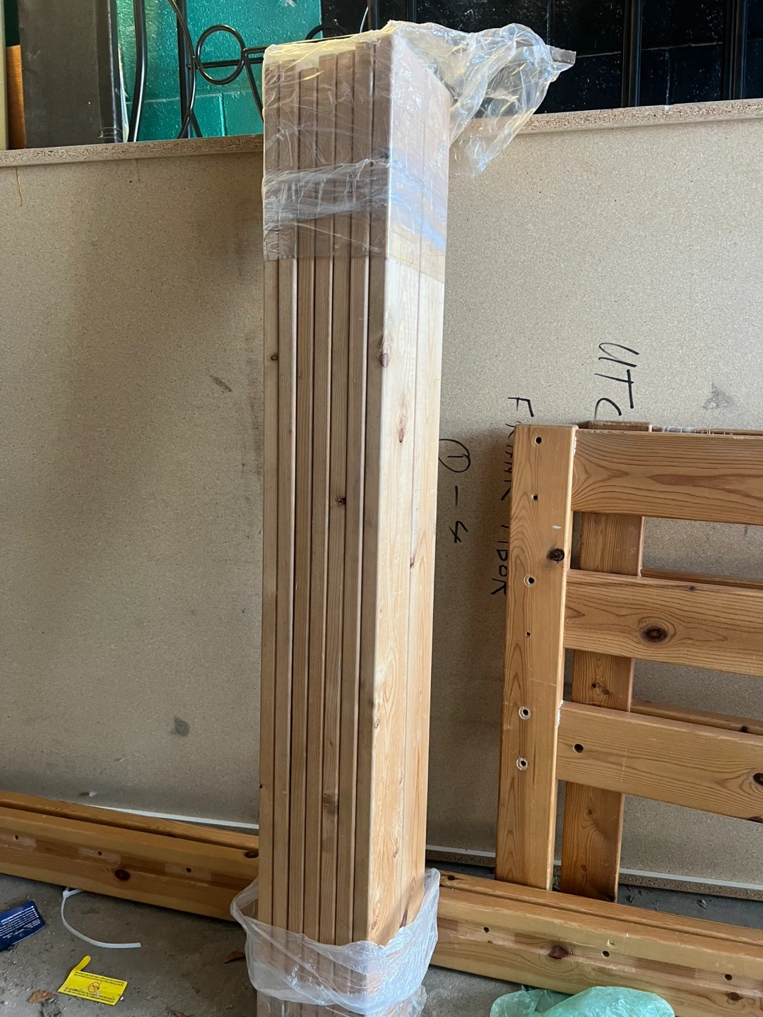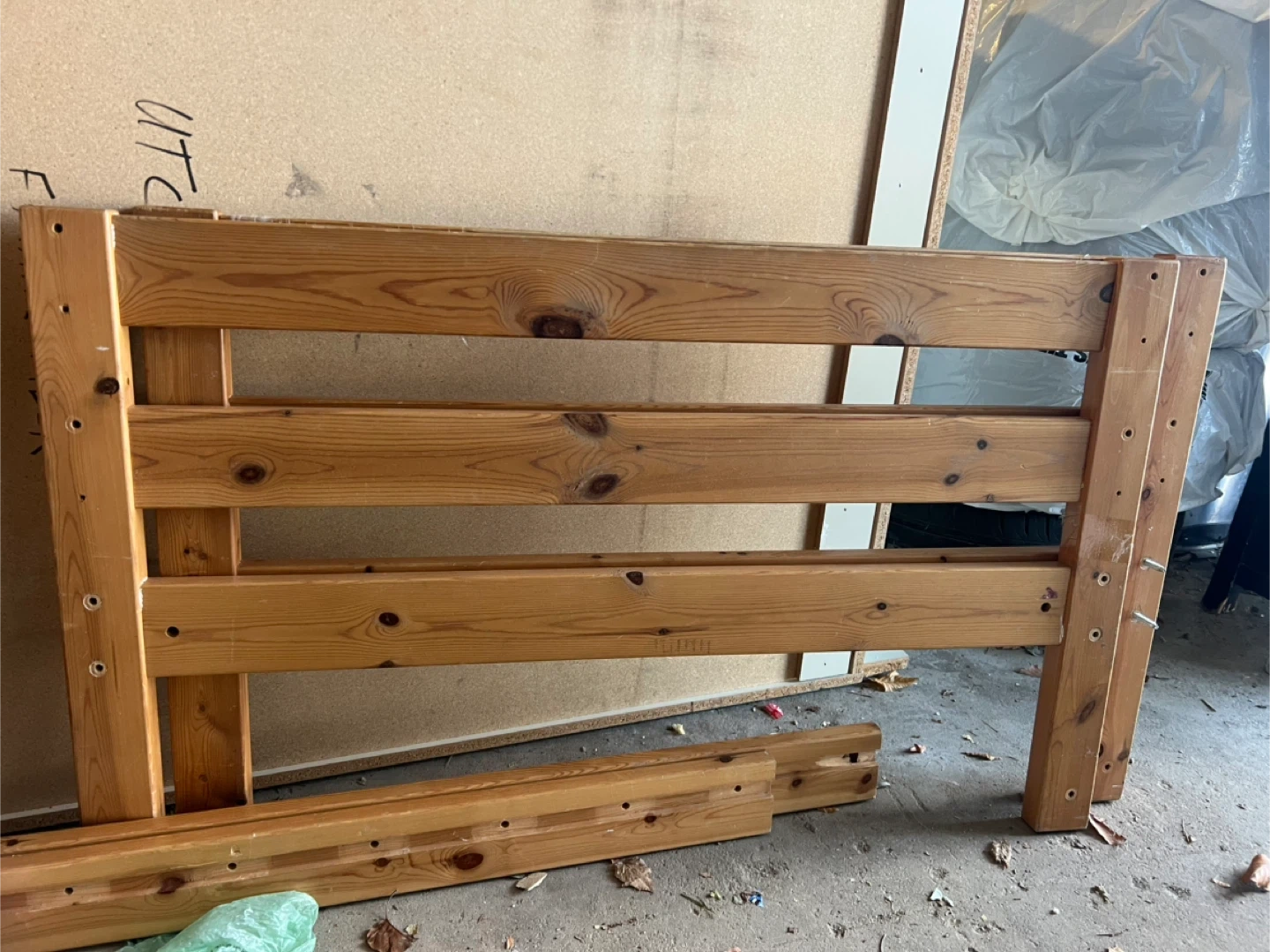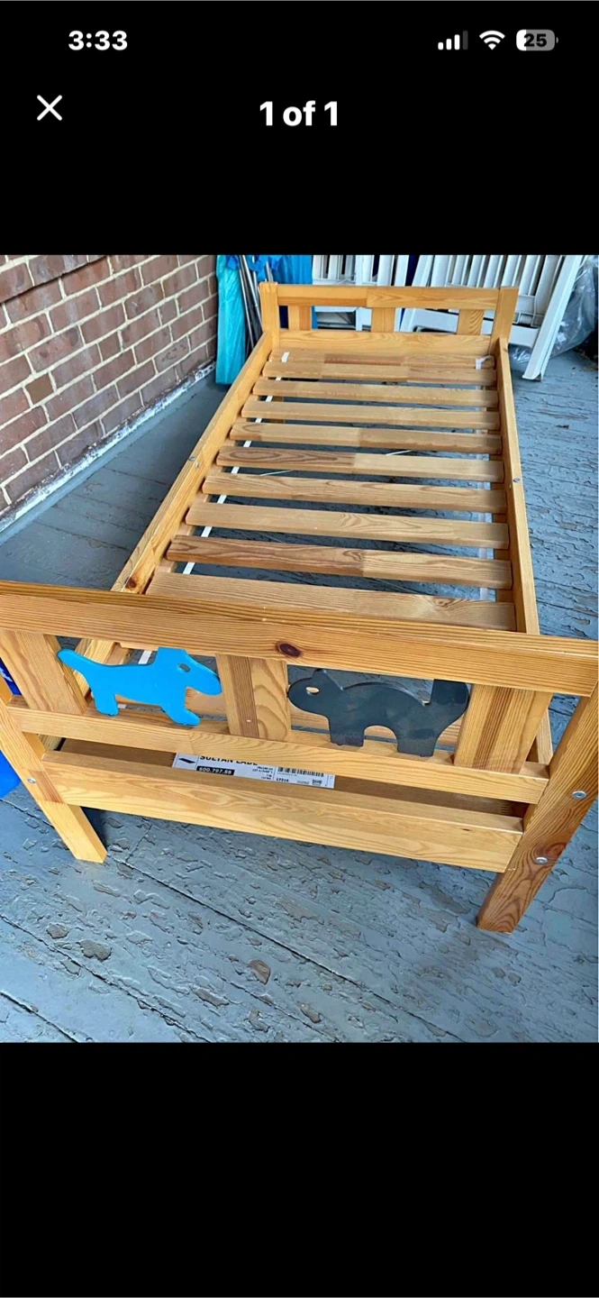This IKEA toddler bed frame is made of natural wood. It features fun dinosaur cutouts on the headboard and footboard. The slatted base provides sturdy support for a mattress.