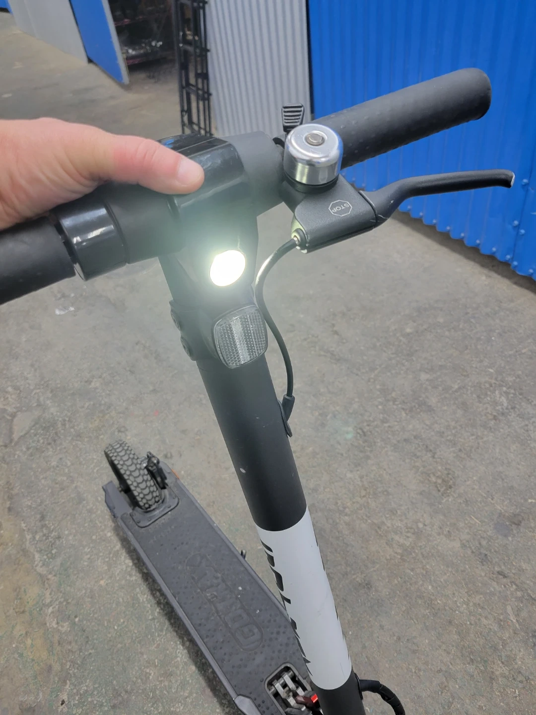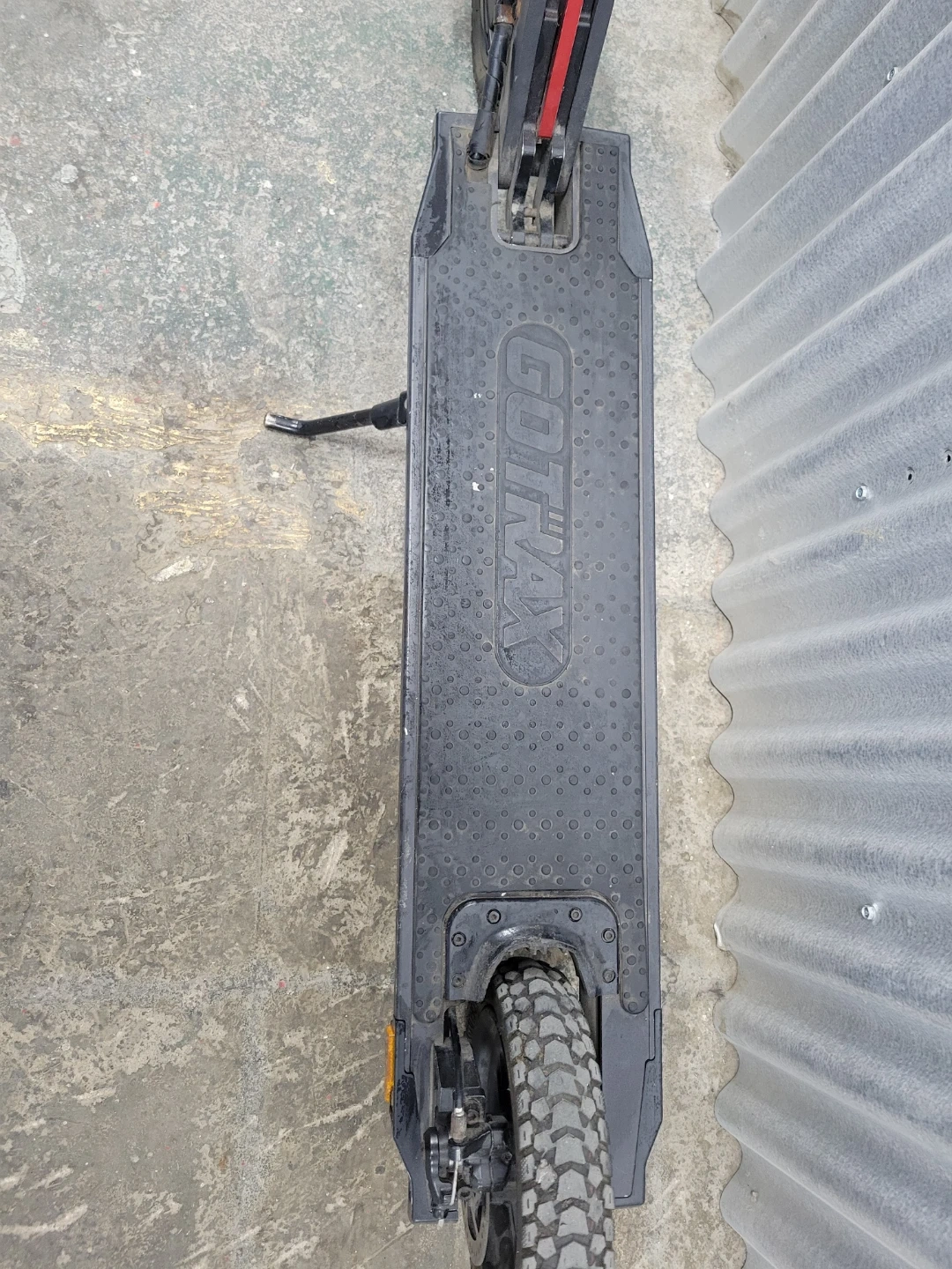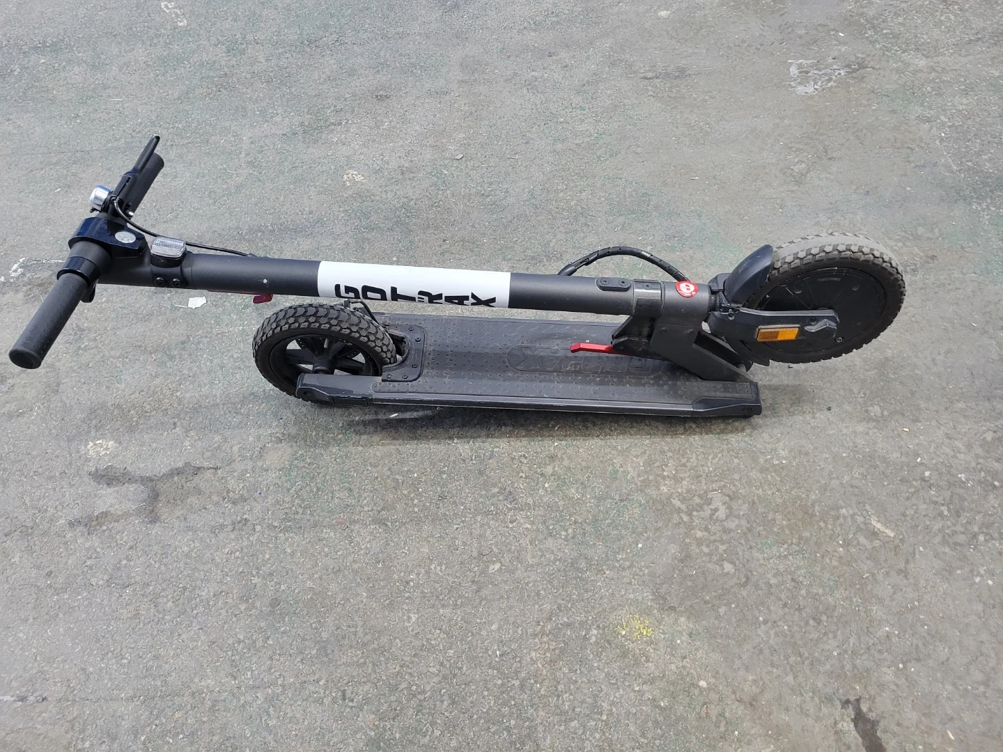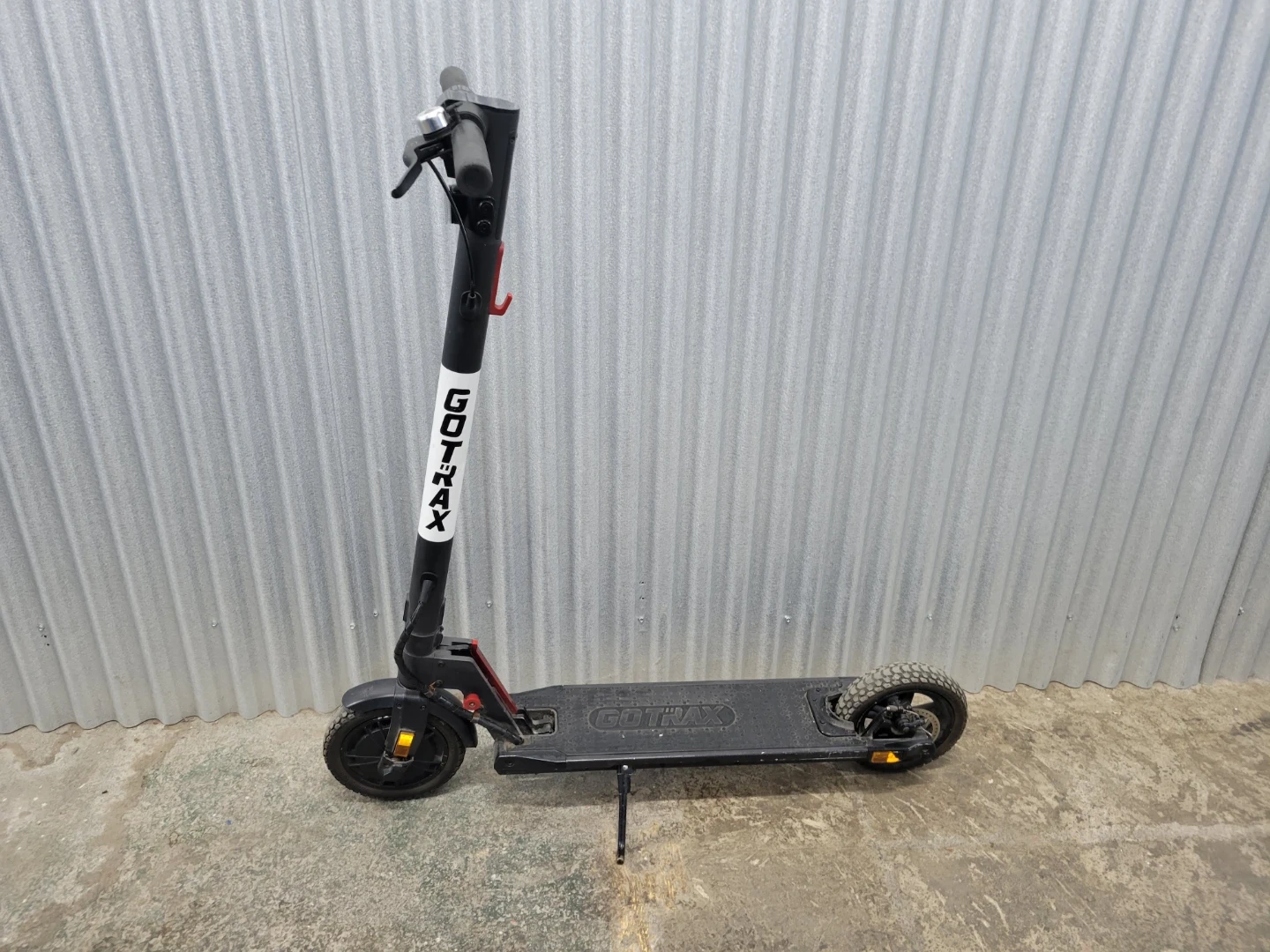 This is a GOTRAX electric scooter. It has rugged tires for varied terrain and a disc brake system for stopping power. The handlebars are adjustable and include a bell.