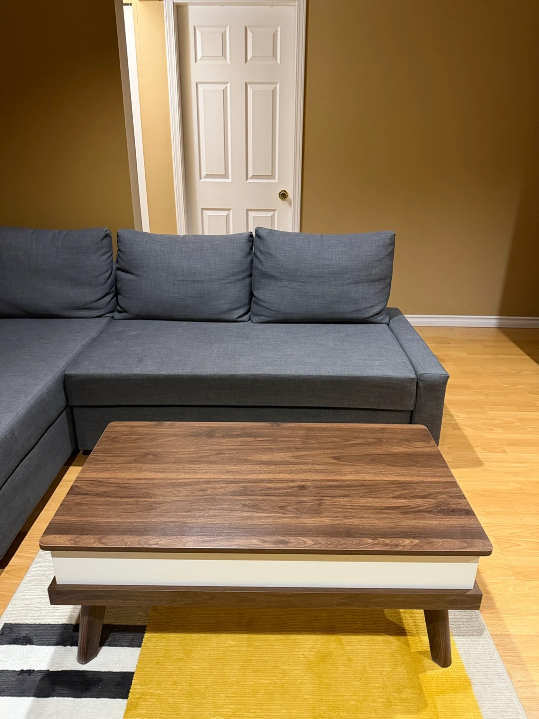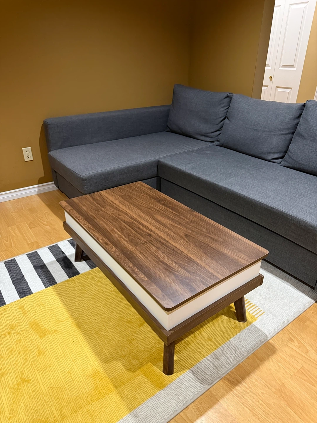 A modern lift-top coffee table featuring a walnut-look surface and ample hidden storage. Its design makes it handy for working or snacking from the couch. This table offers practical storage space for your living room needs. Stain Resistant, Scratch Resistant.