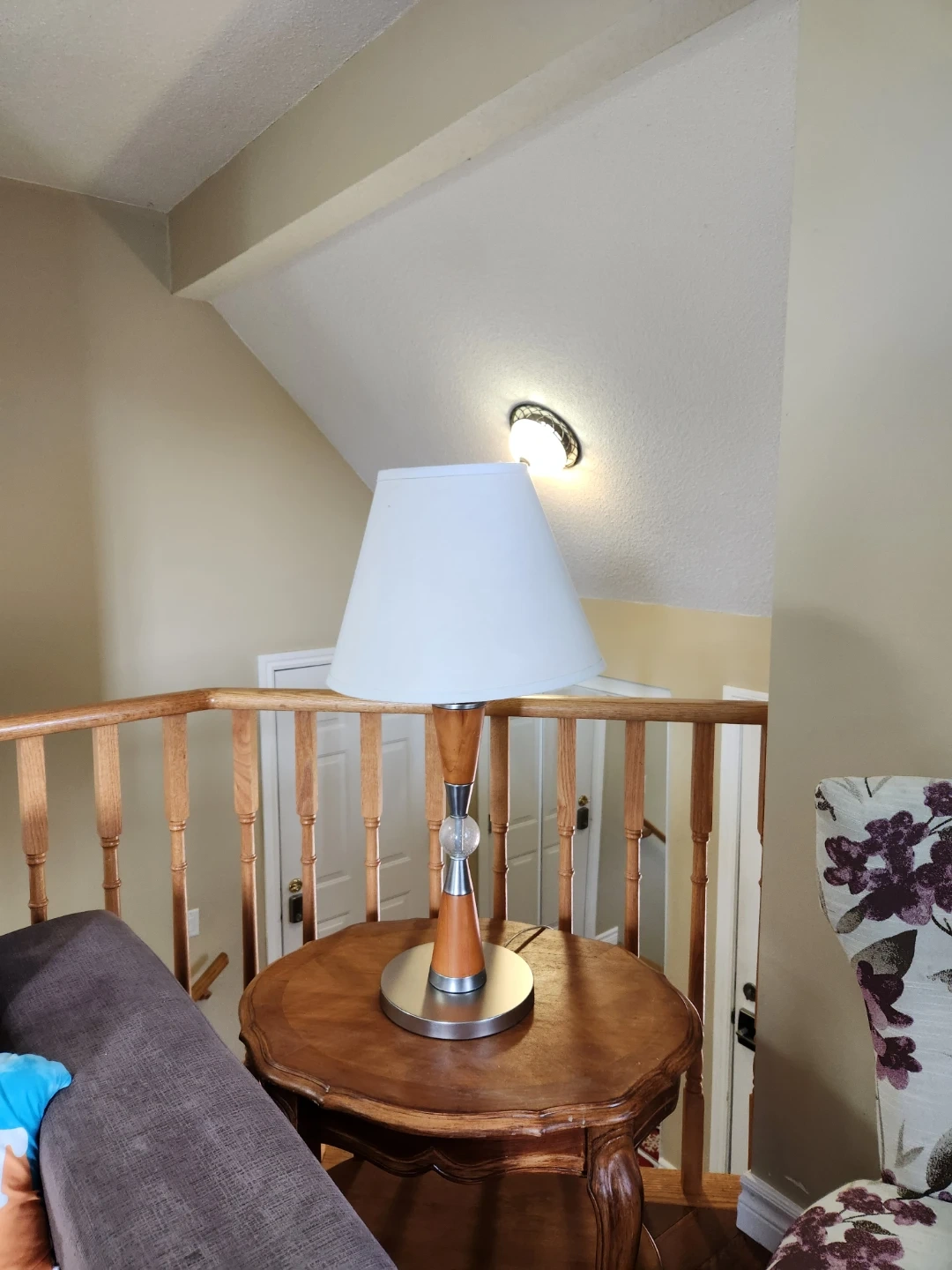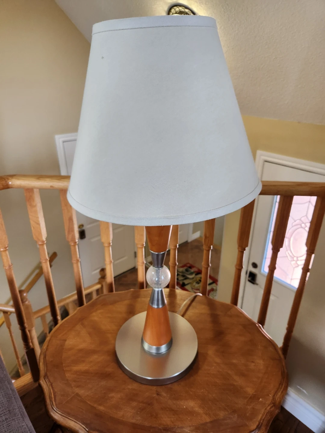 A stylish table lamp with a white fabric shade. It features a wood and metal base with a decorative glass accent. Great for adding ambient lighting to any room!