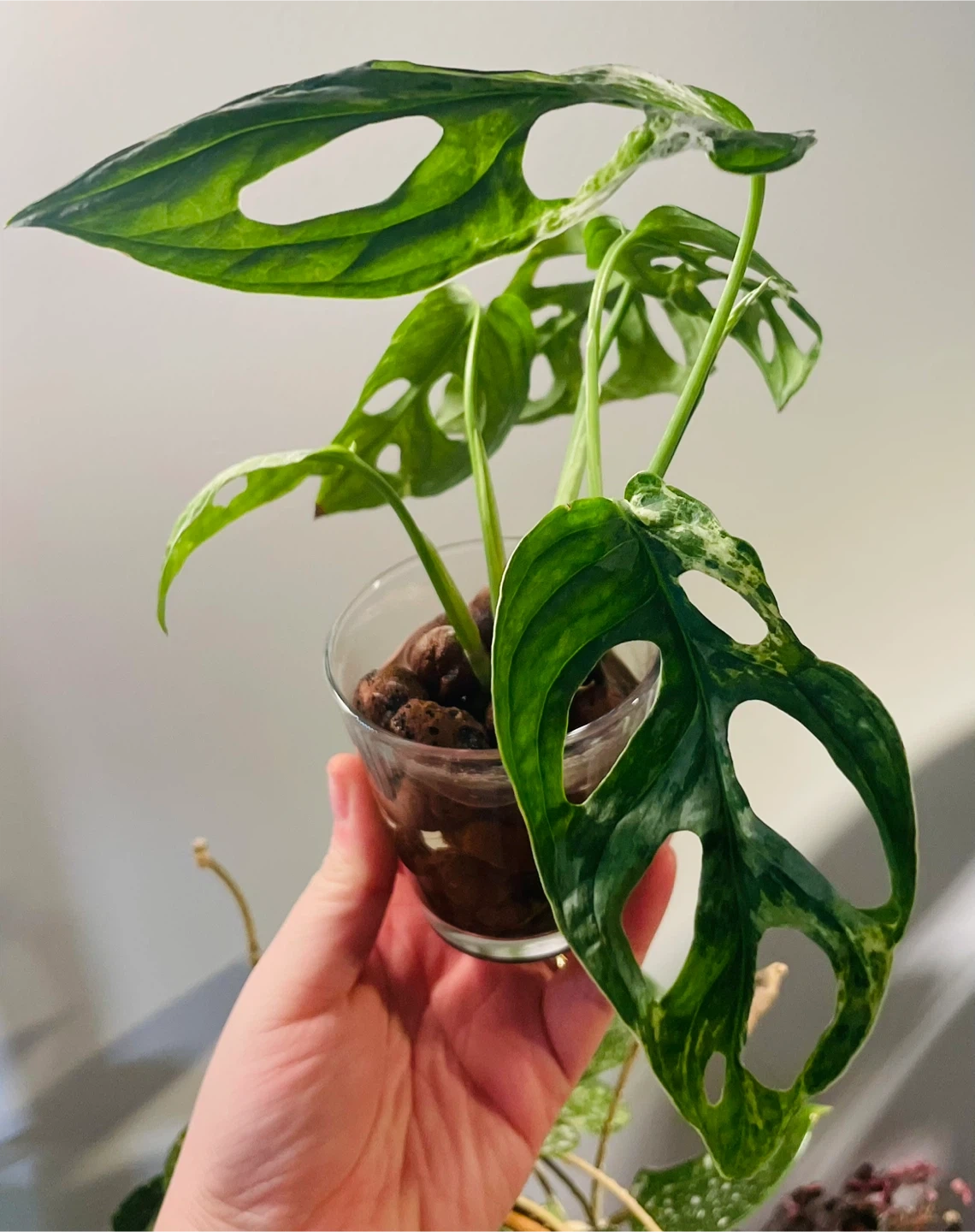 Healthy variegated Monstera Adansonii plant with fenestrated leaves. It's growing in a clear glass pot with leca. It's a beautiful statement plant for any indoor space! It's approximately 12 inches tall.
