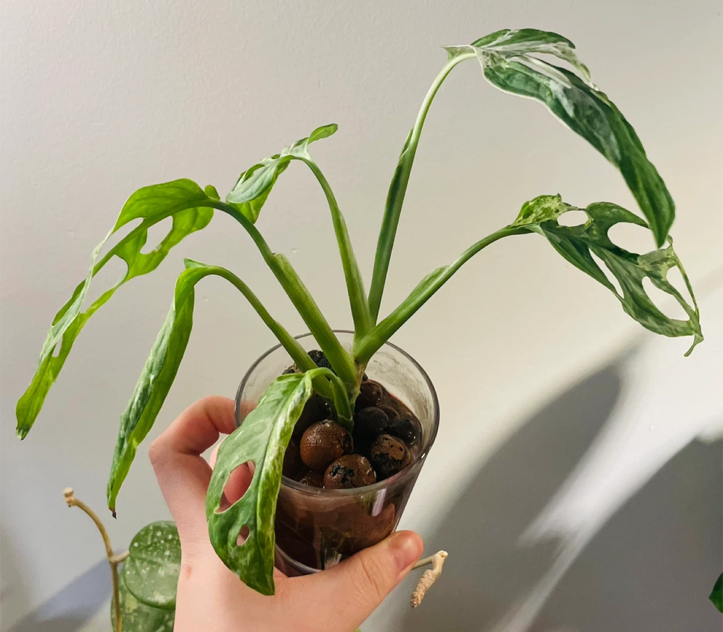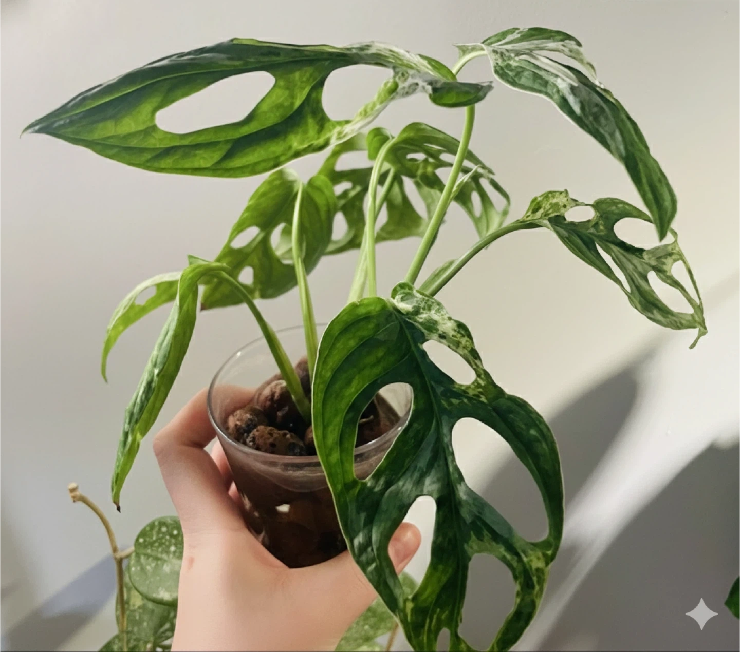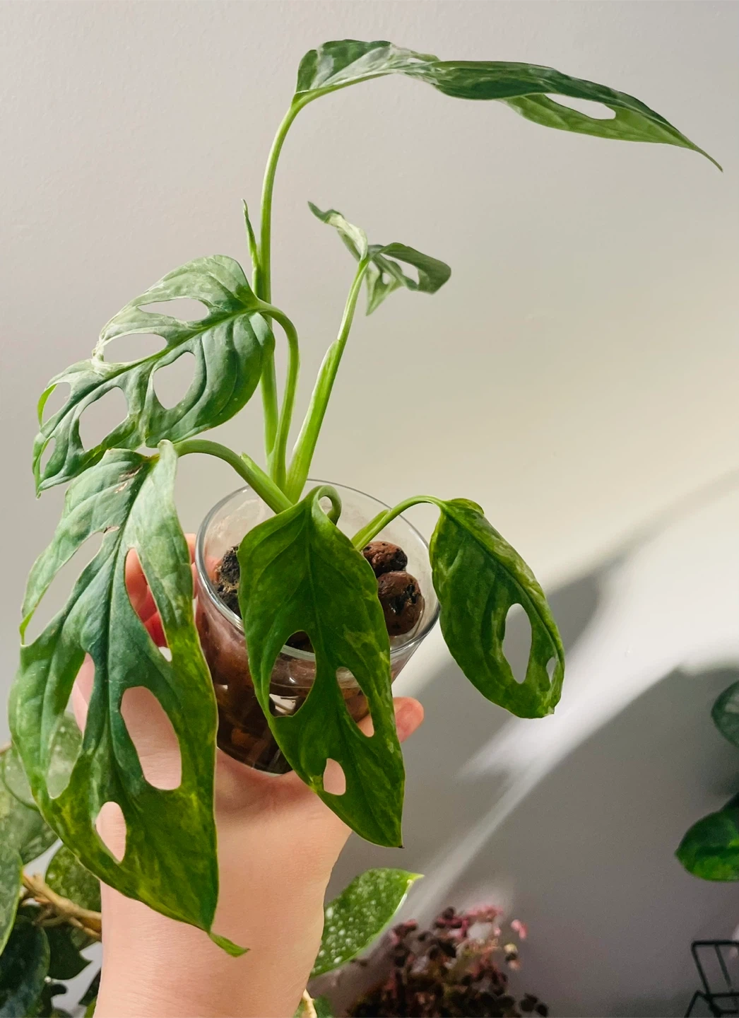 Healthy variegated Monstera Adansonii plant with fenestrated leaves. It's growing in a clear glass pot with leca. It's a beautiful statement plant for any indoor space! It's approximately 12 inches tall.