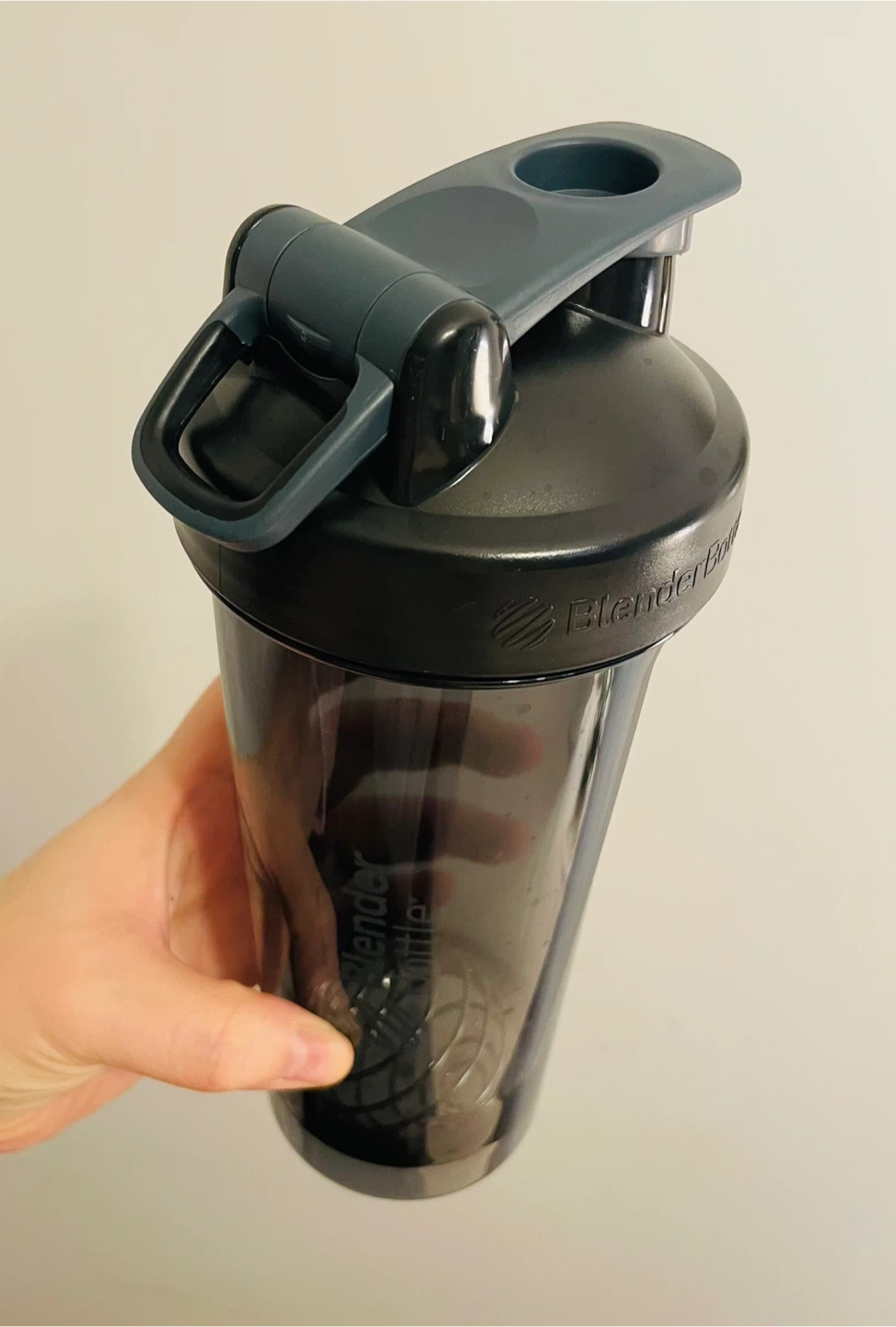 This is a BlenderBottle Classic shaker bottle with a 20 oz capacity. It's made of durable plastic and includes a wire whisk ball for mixing. The lid has a secure flip-top closure.