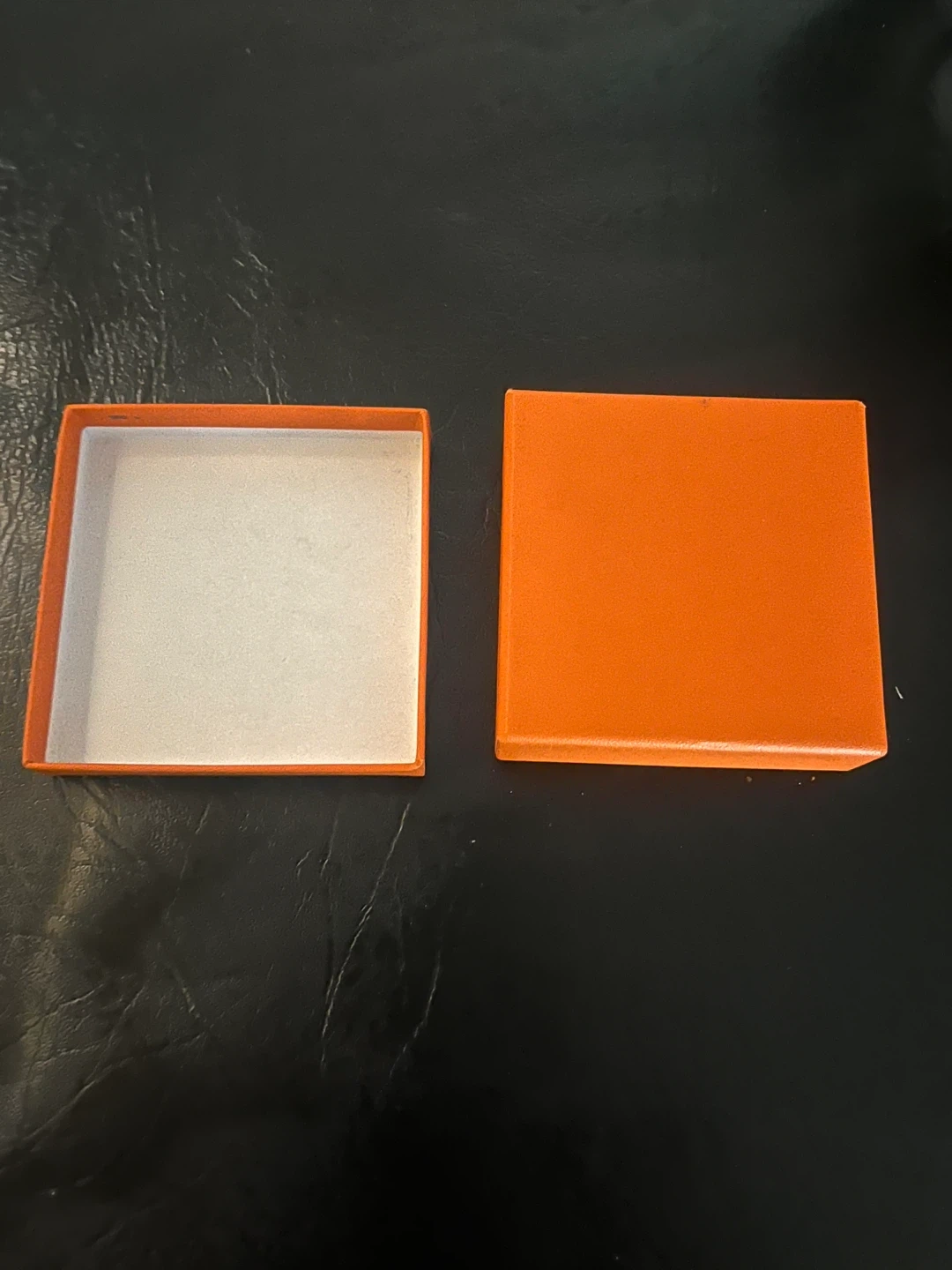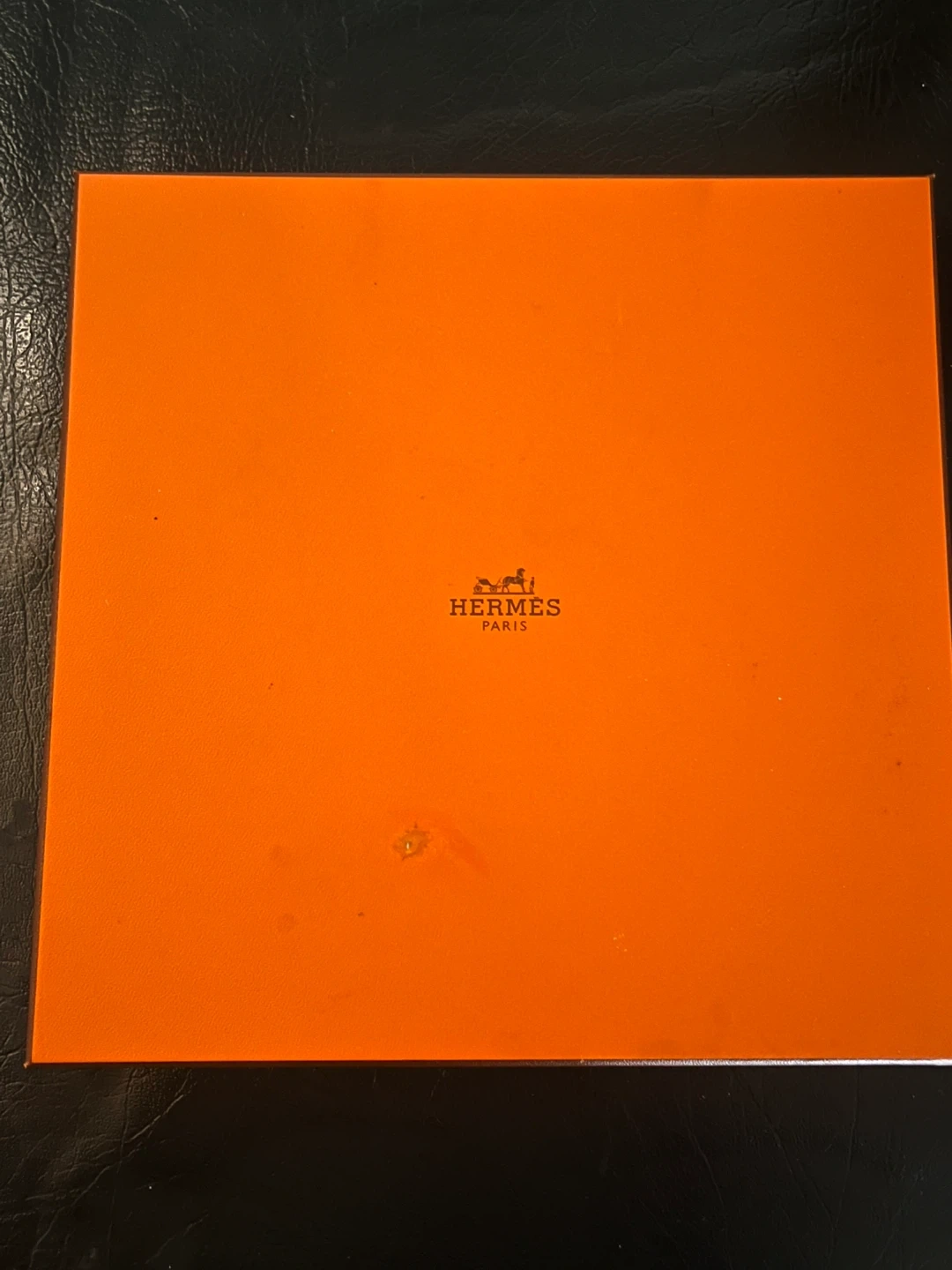 This listing includes an orange Hermès box and a matching shopping bag. The box is designed for Hermès scarves and includes care instructions. It's a classic orange colour.