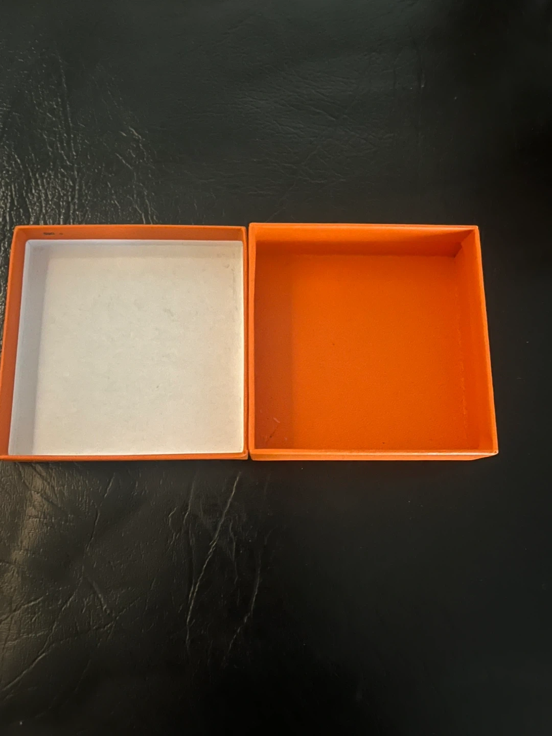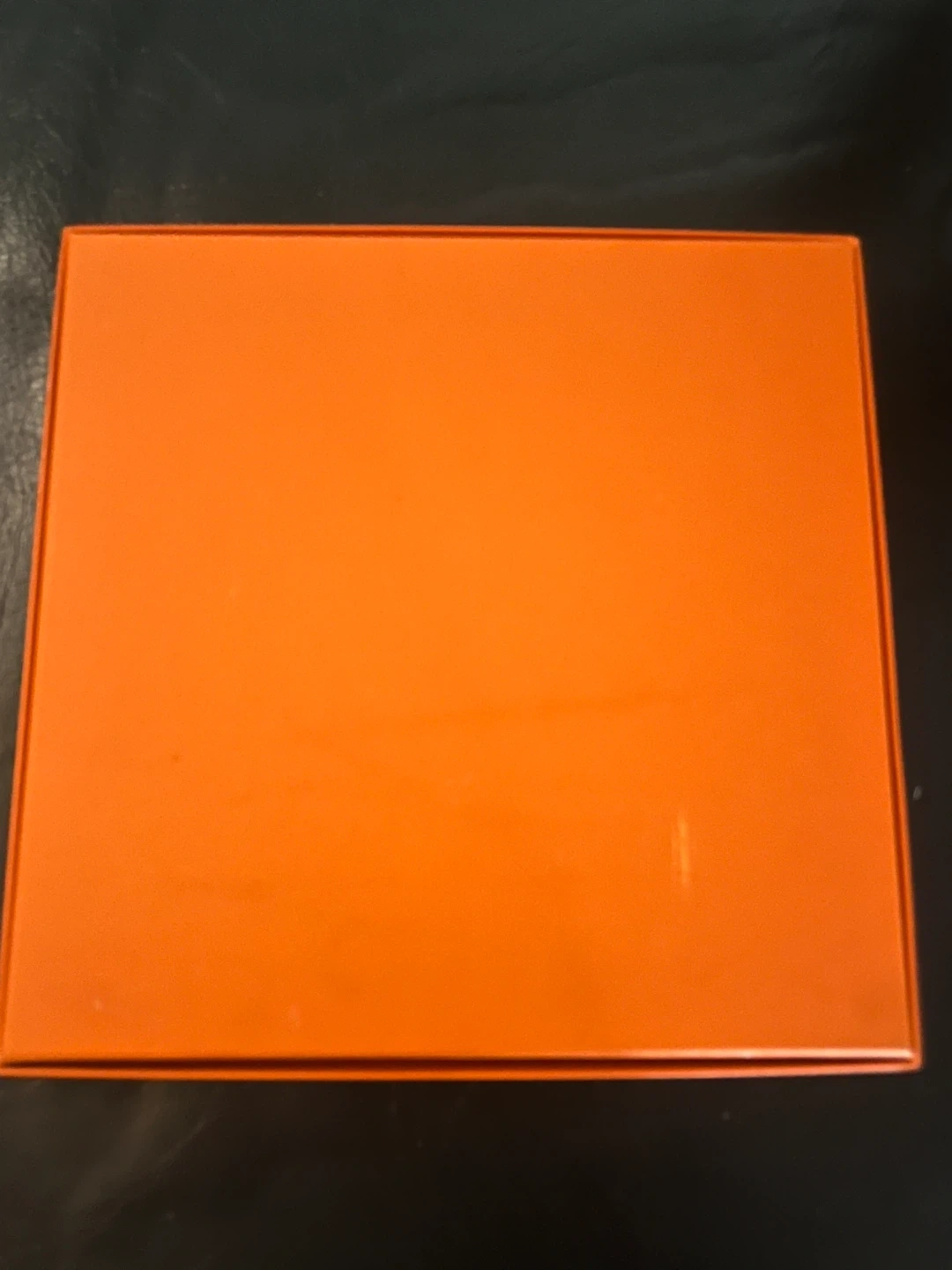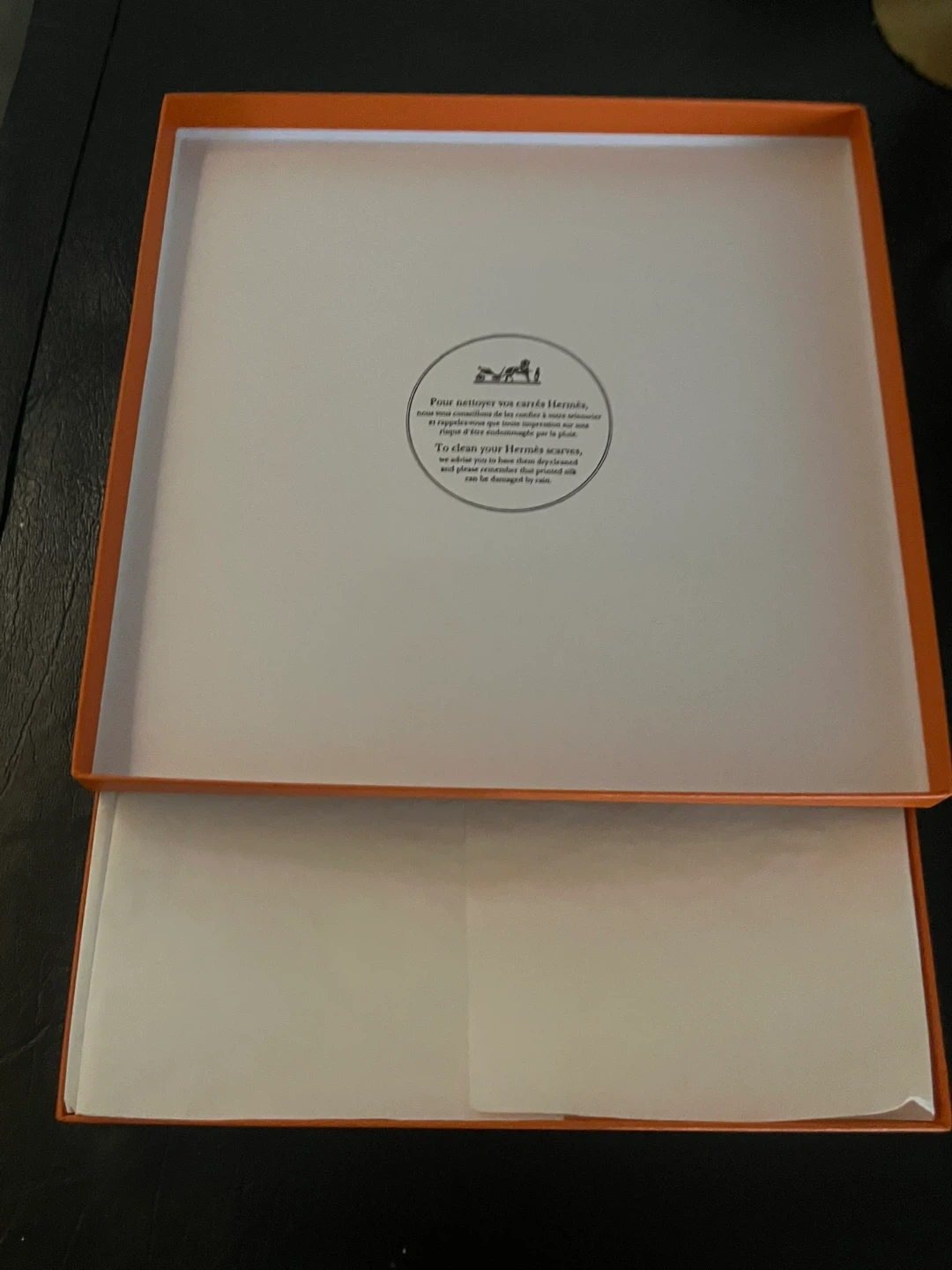 This listing includes an orange Hermès box and a matching shopping bag. The box is designed for Hermès scarves and includes care instructions. It's a classic orange colour.