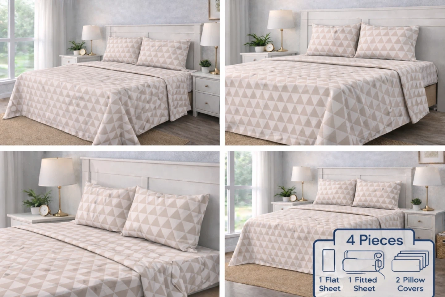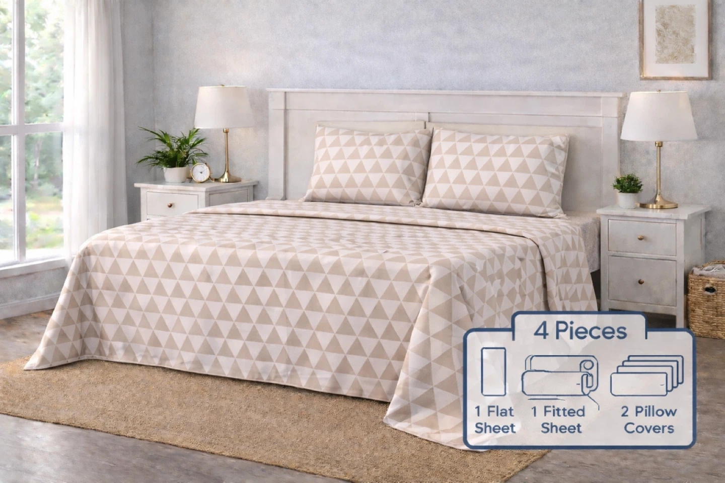 This Brand new 4-piece sheet set includes 1 flat sheet, 1 fitted sheet, and 2 pillow covers. The queen-sized set features a geometric triangle pattern. Material is soft and durable.