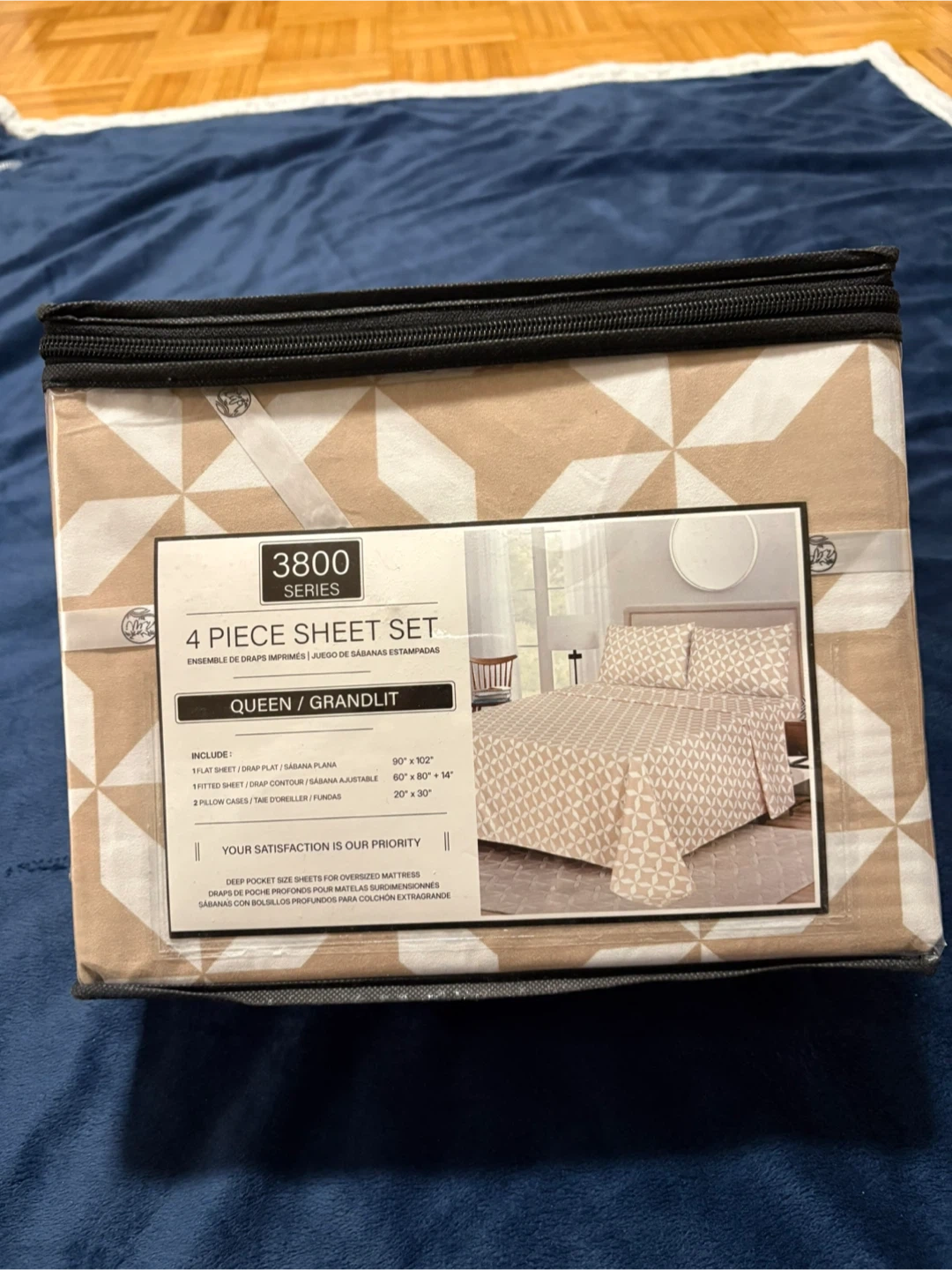 This Brand new 4-piece sheet set includes 1 flat sheet, 1 fitted sheet, and 2 pillow covers. The queen-sized set features a geometric triangle pattern. Material is soft and durable.