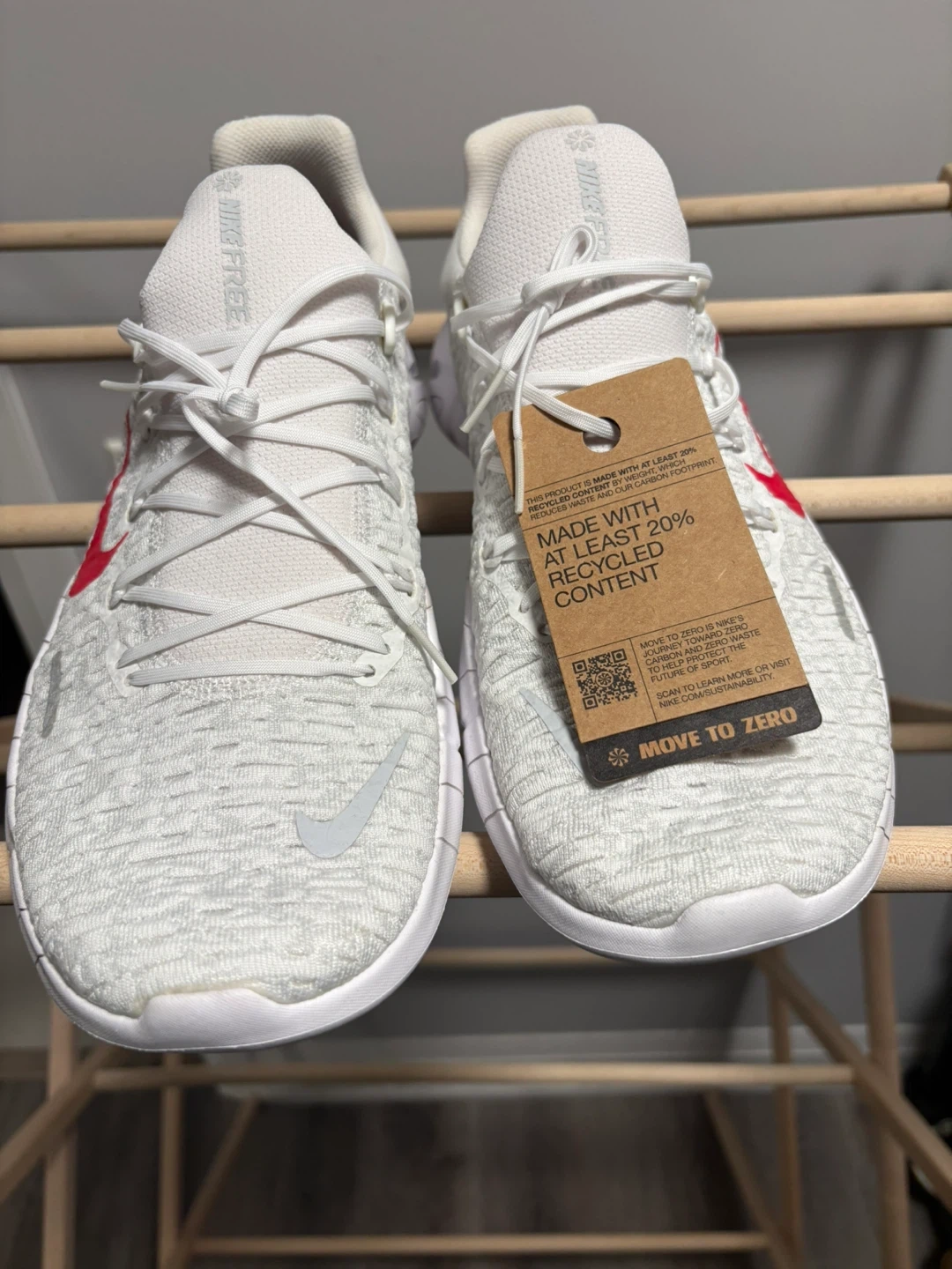 These Nike Free RN 5.0 running shoes are white with red accents. They're made with at least 20% recycled content. The shoes are size 13