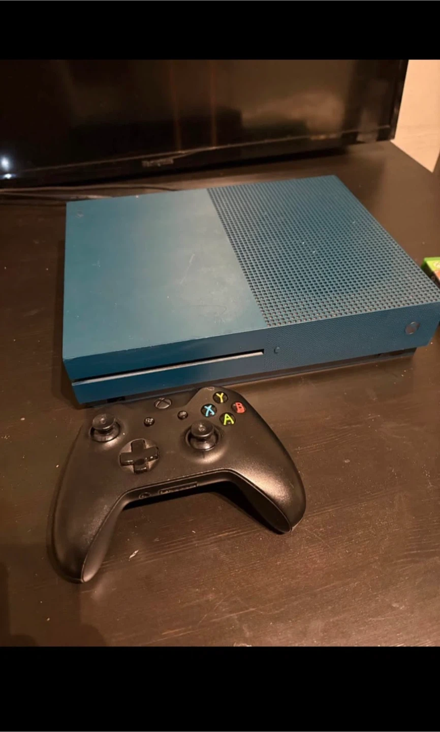 Xbox One S Blue color. Works perfectly with all cables and controller.