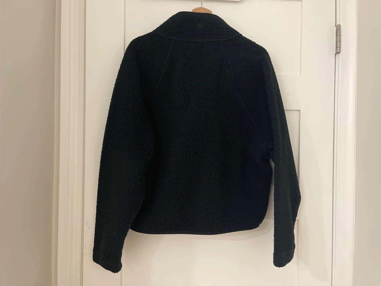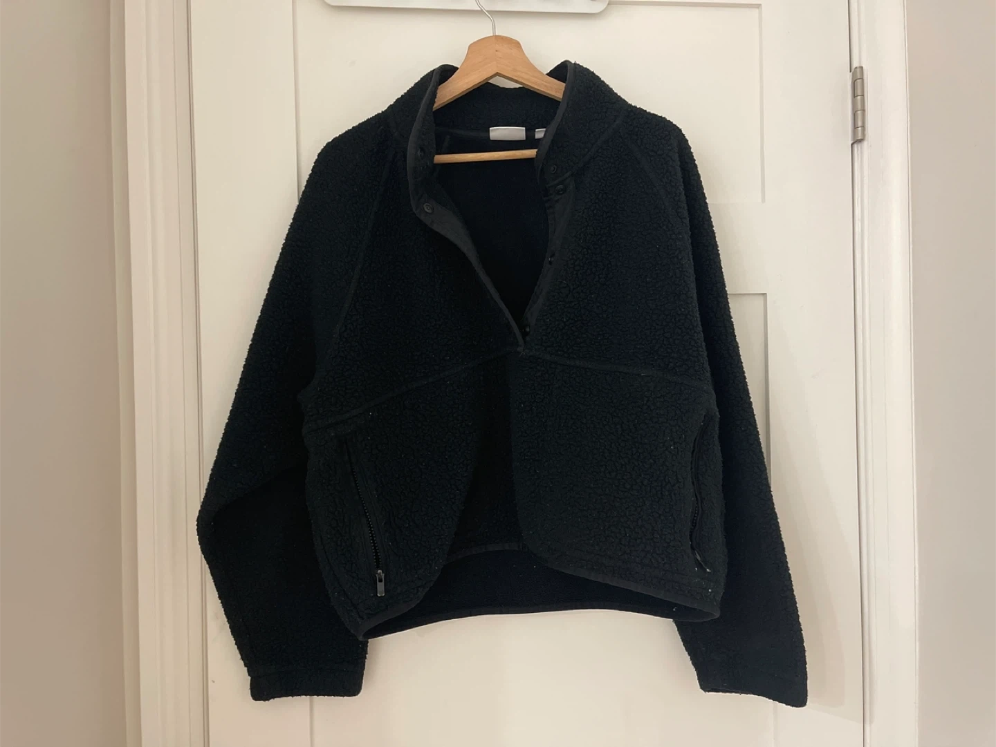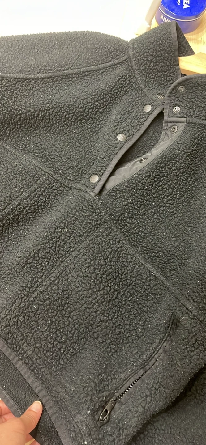 Cozy black fleece pullover top with snap closure and zippered pockets. It's made of a soft, textured material.