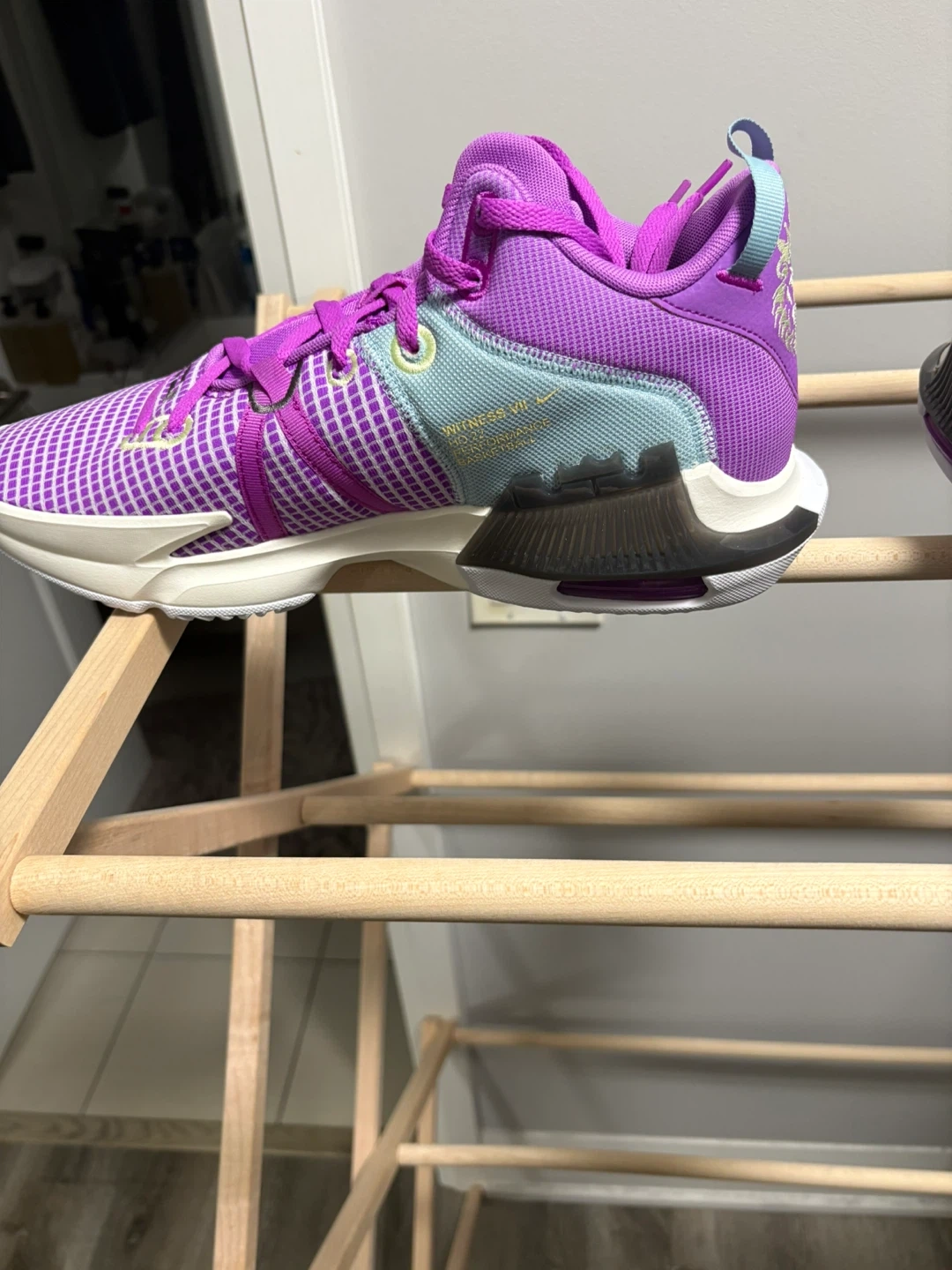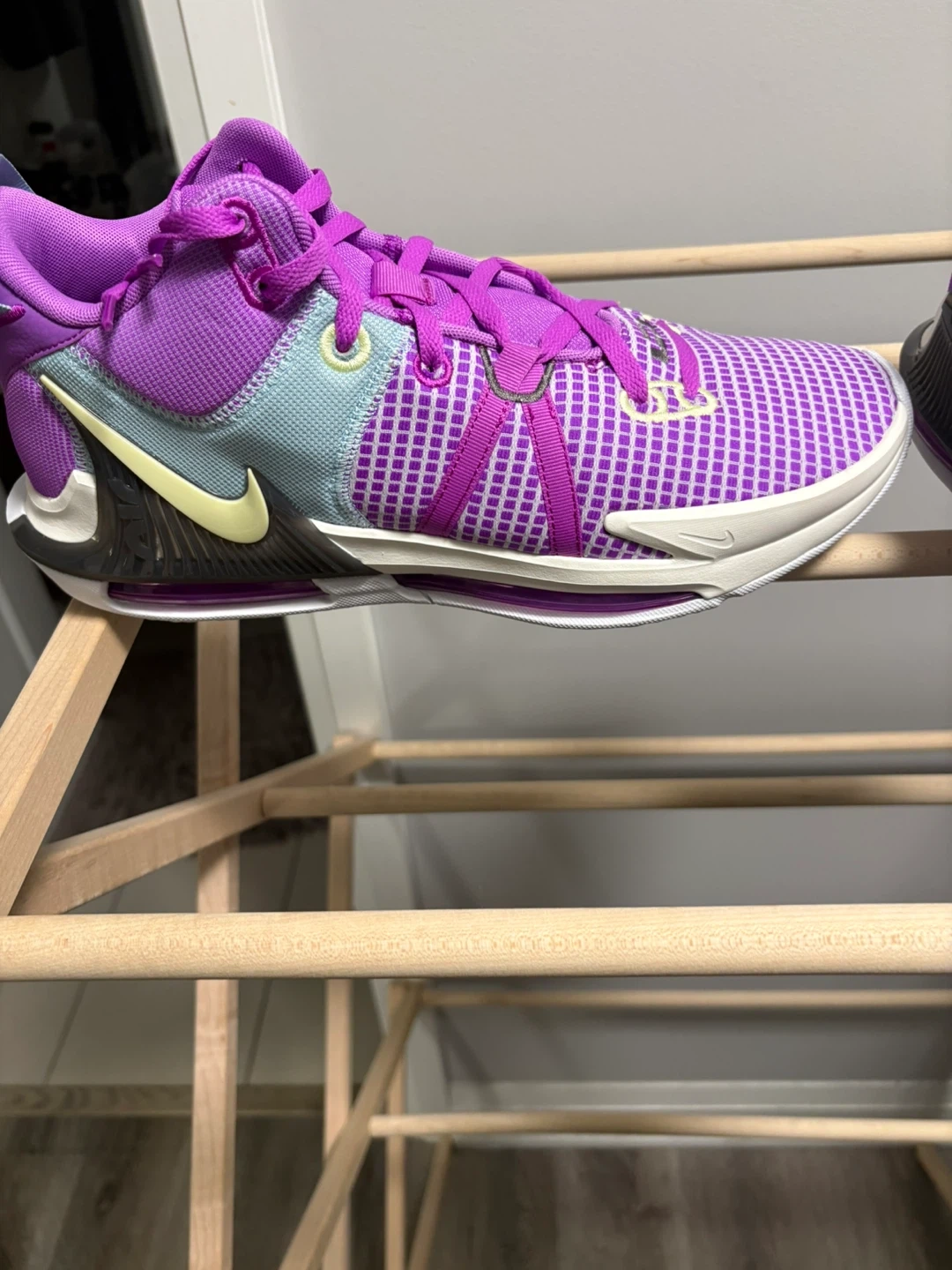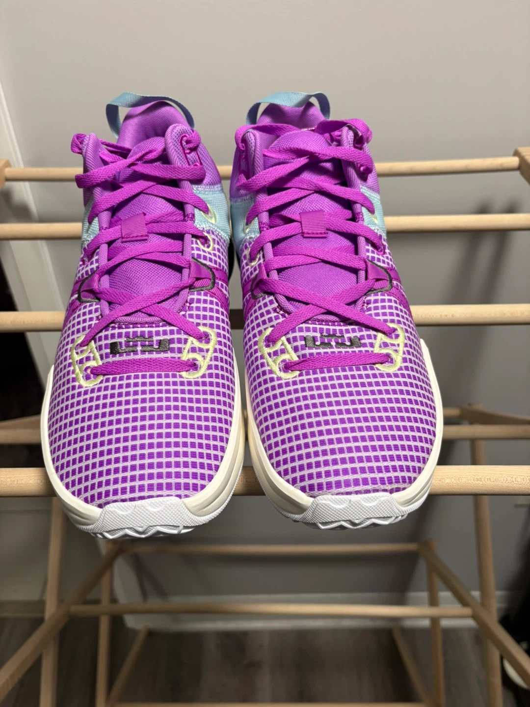 Nike LeBron XXI basketball shoes in a striking purple and light blue colourway. These kicks are built for performance on the court. They feature a breathable mesh upper with a distinctive grid pattern. Great for athletes who want style and support!