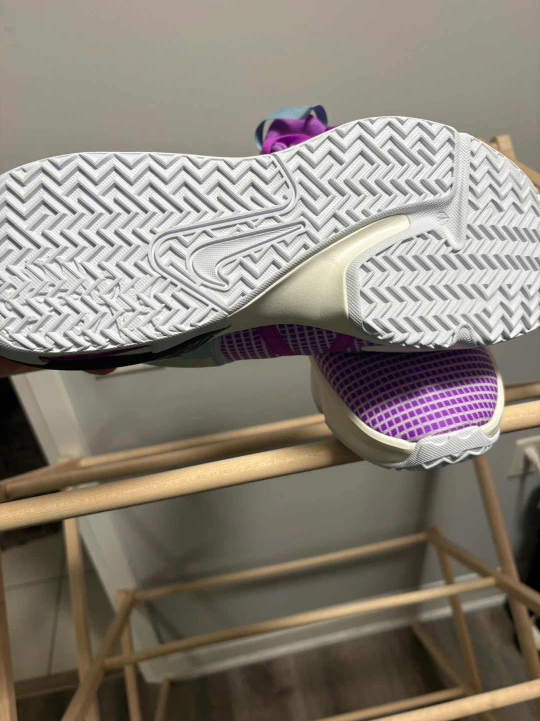 Nike LeBron XXI basketball shoes in a striking purple and light blue colourway. These kicks are built for performance on the court. They feature a breathable mesh upper with a distinctive grid pattern. Great for athletes who want style and support!