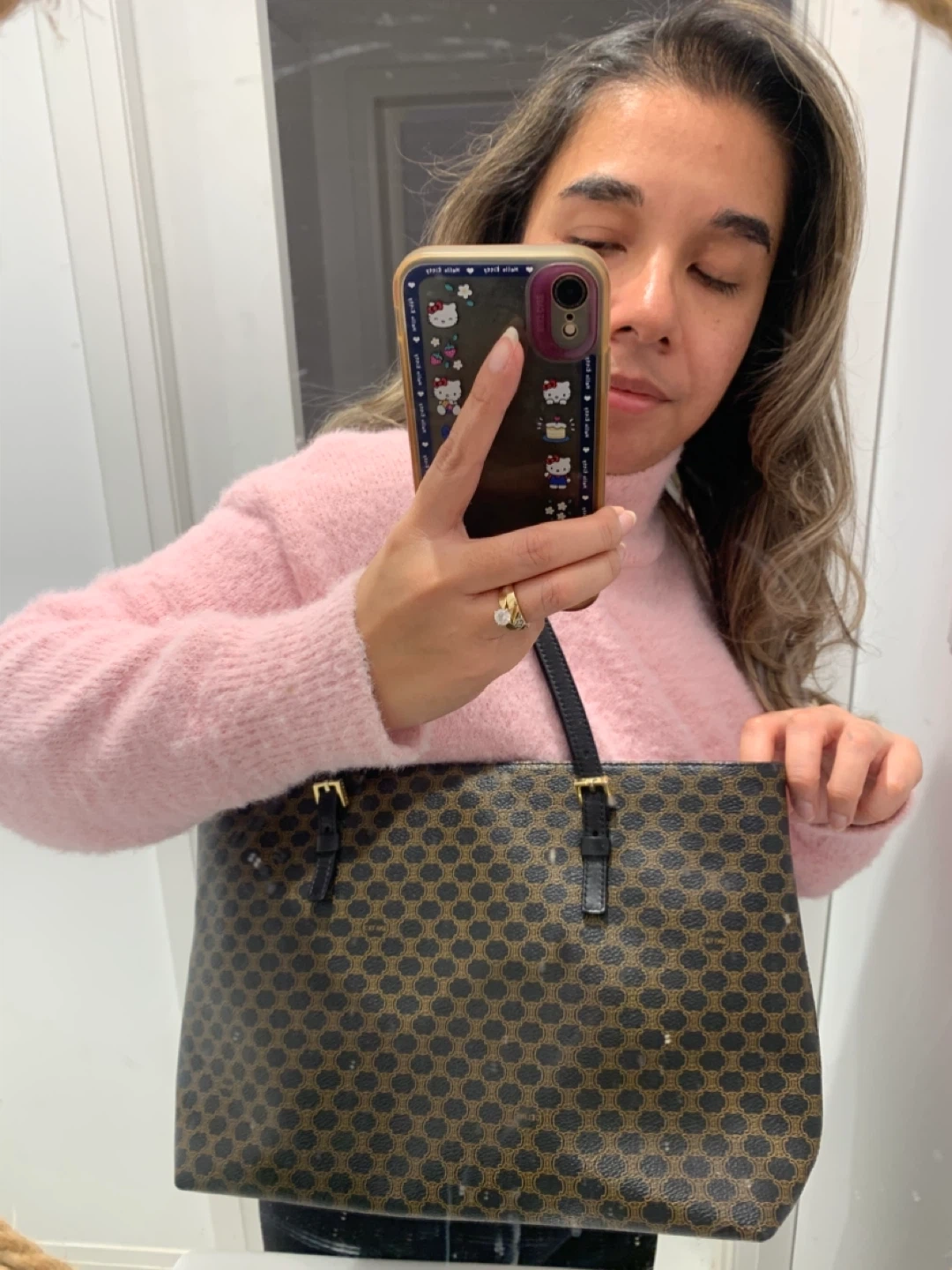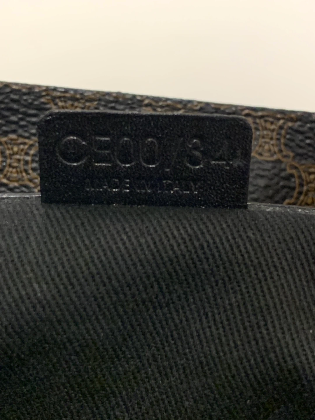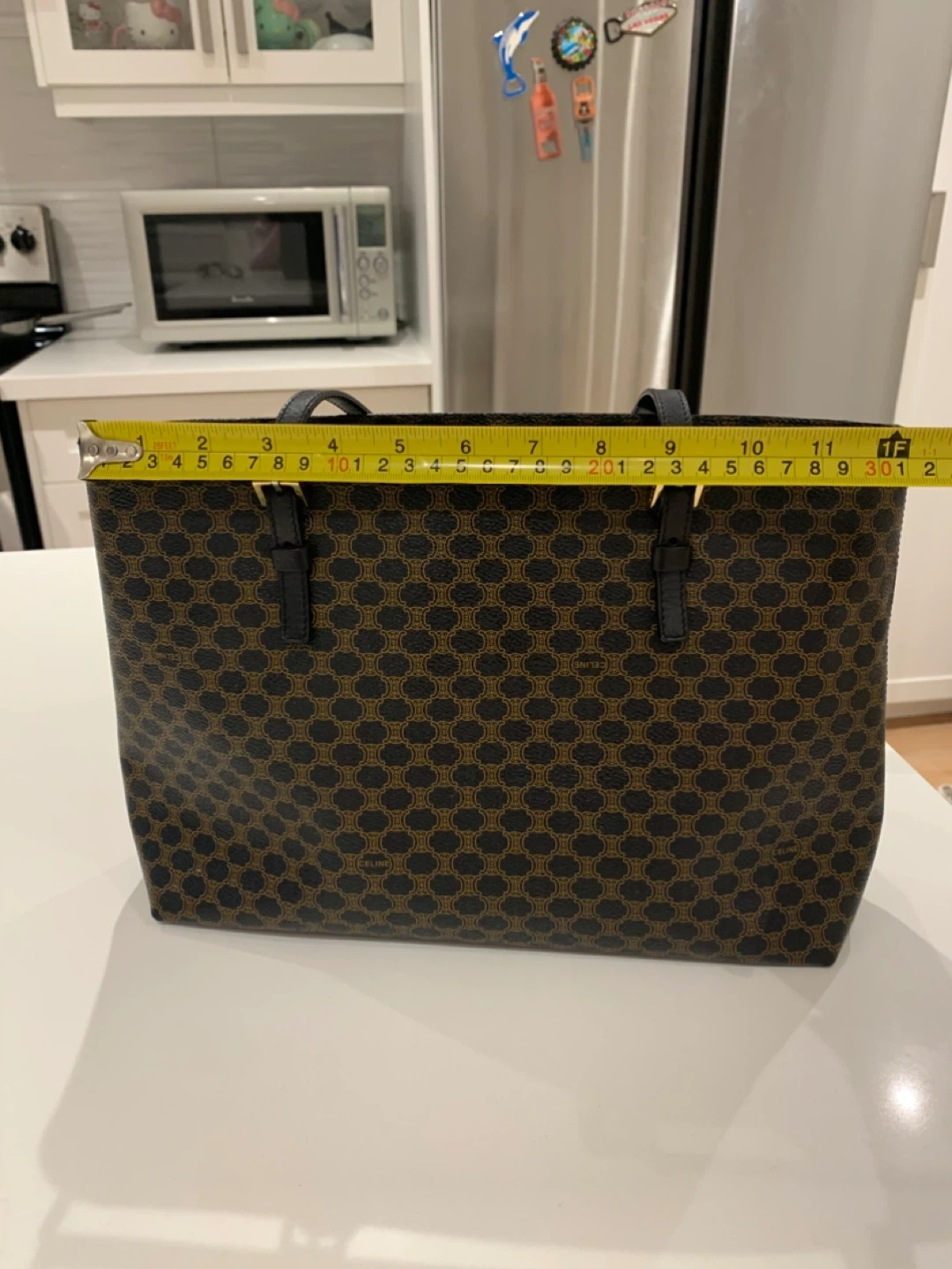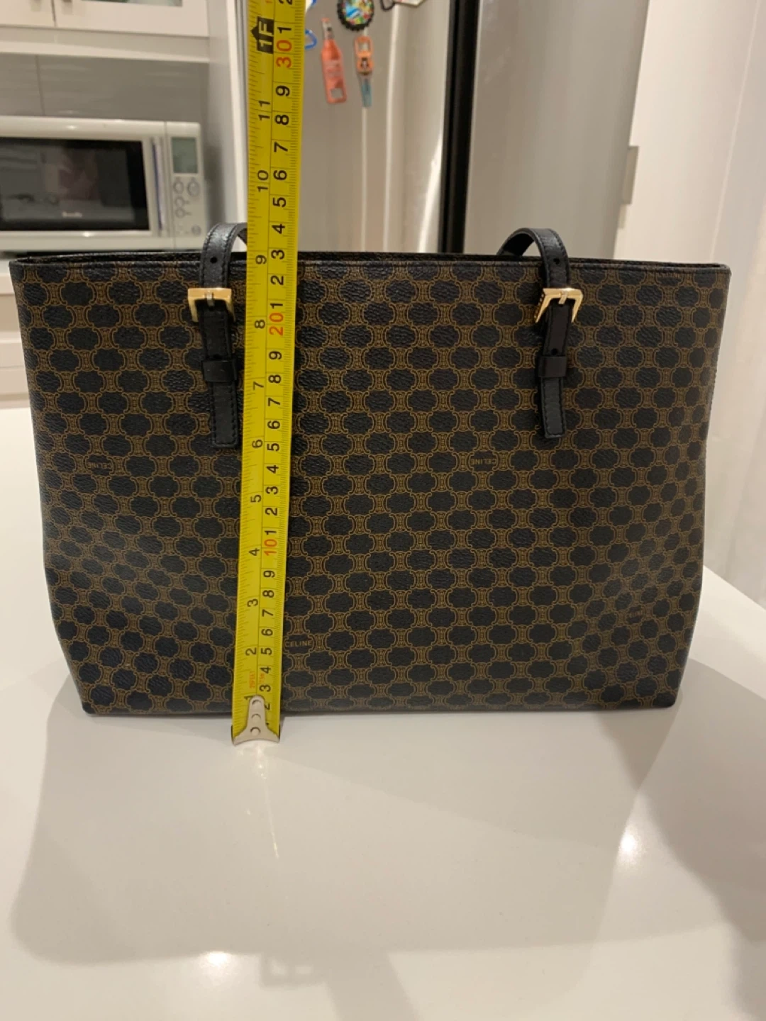This is a Celine tote bag with the signature pattern. It's made in Italy and features black leather trim and gold hardware. The bag measures approximately 12 inches in height and 16 inches in width.