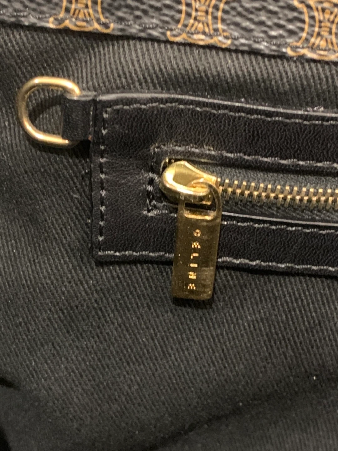 This is a Celine tote bag with the signature pattern. It's made in Italy and features black leather trim and gold hardware. The bag measures approximately 12 inches in height and 16 inches in width.