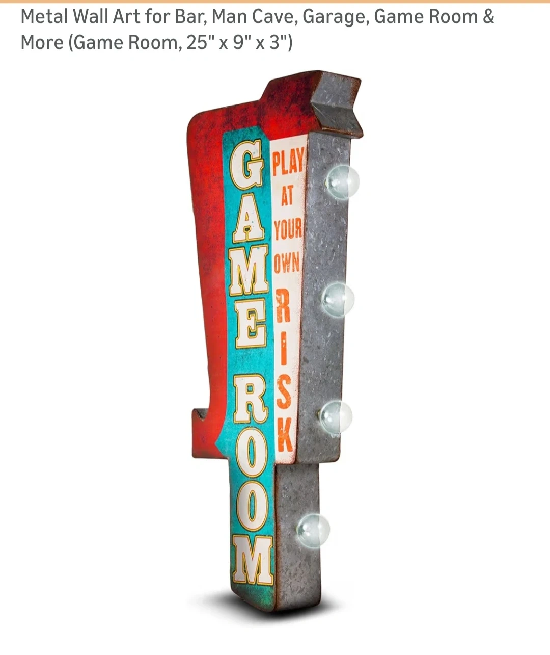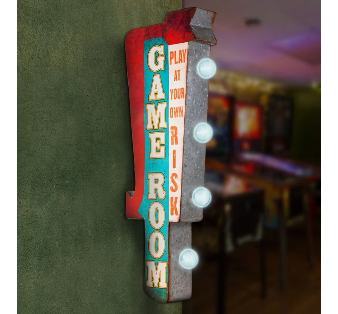 This metal wall art features a "GAME ROOM" marquee with "PLAY AT YOUR OWN RISK" text. It's designed with vintage-style marquee lights that illuminate the sign. Measures 25" x 9" x 3".