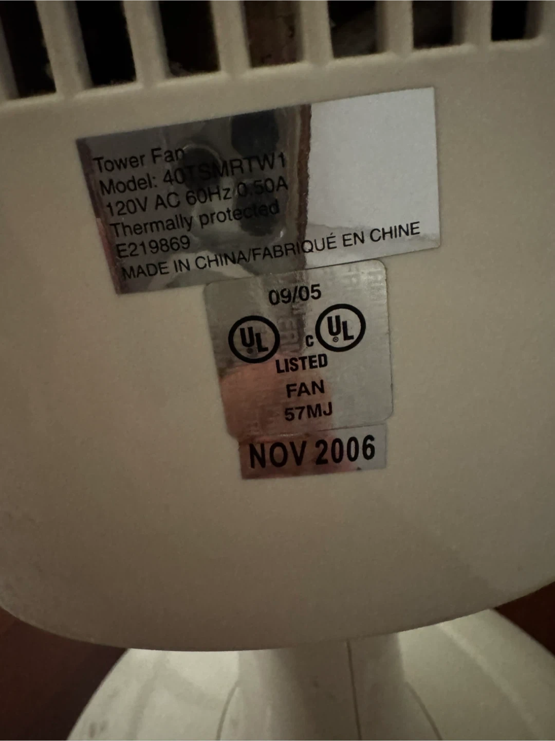 This is a tower fan with multiple speed settings and oscillation. It comes with a remote control for convenience. It's 120V AC and 0.50A.