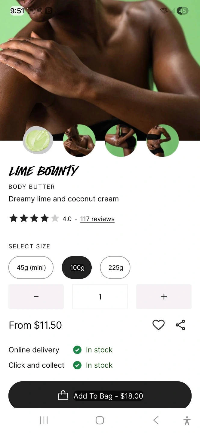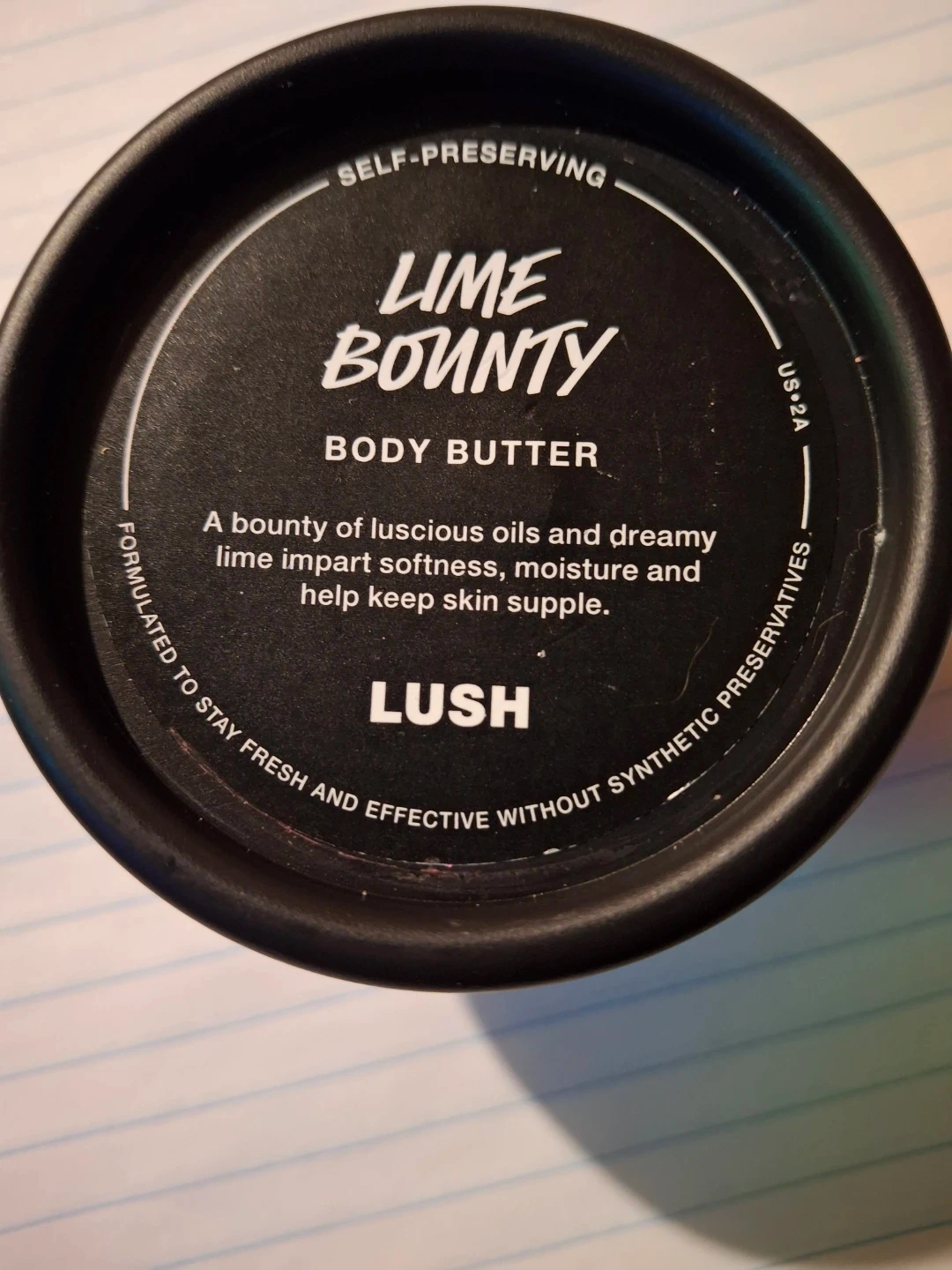 This is a 100g container of Lush Lime Bounty Body Butter, featuring a dreamy lime and coconut cream scent. It's formulated to provide softening and moisturizing benefits. This body butter is great for anyone looking to add extra smoothness and hydration to their skin.