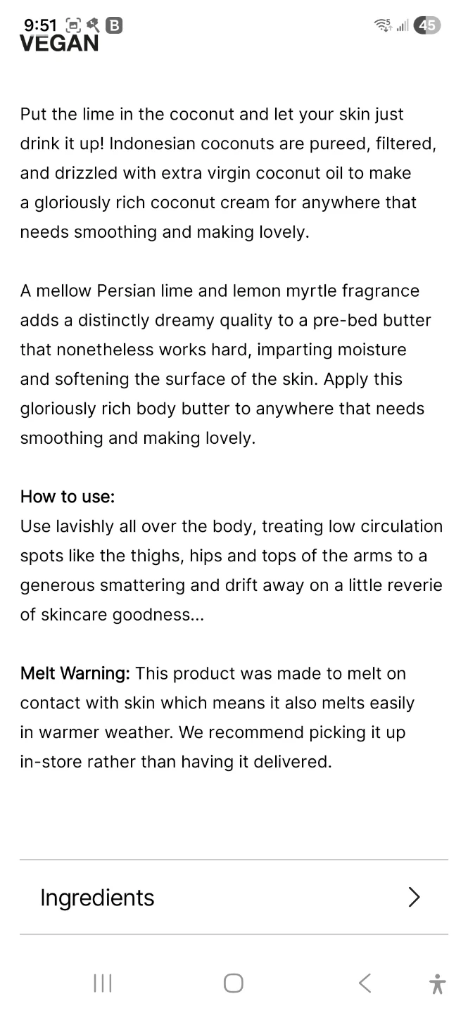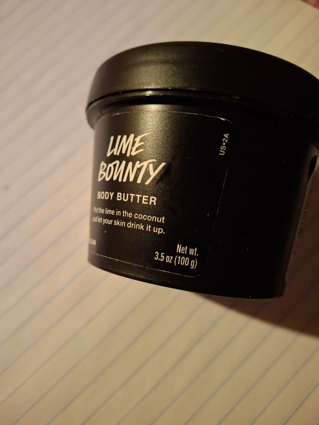 This is a 100g container of Lush Lime Bounty Body Butter, featuring a dreamy lime and coconut cream scent. It's formulated to provide softening and moisturizing benefits. This body butter is great for anyone looking to add extra smoothness and hydration to their skin.