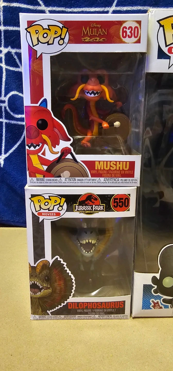 Three Funko Pop! vinyl figures from popular movies. Includes Toothless from How to Train Your Dragon, Mushu from Mulan, and Dilophosaurus from Jurassic Park. All figures are in their original boxes.