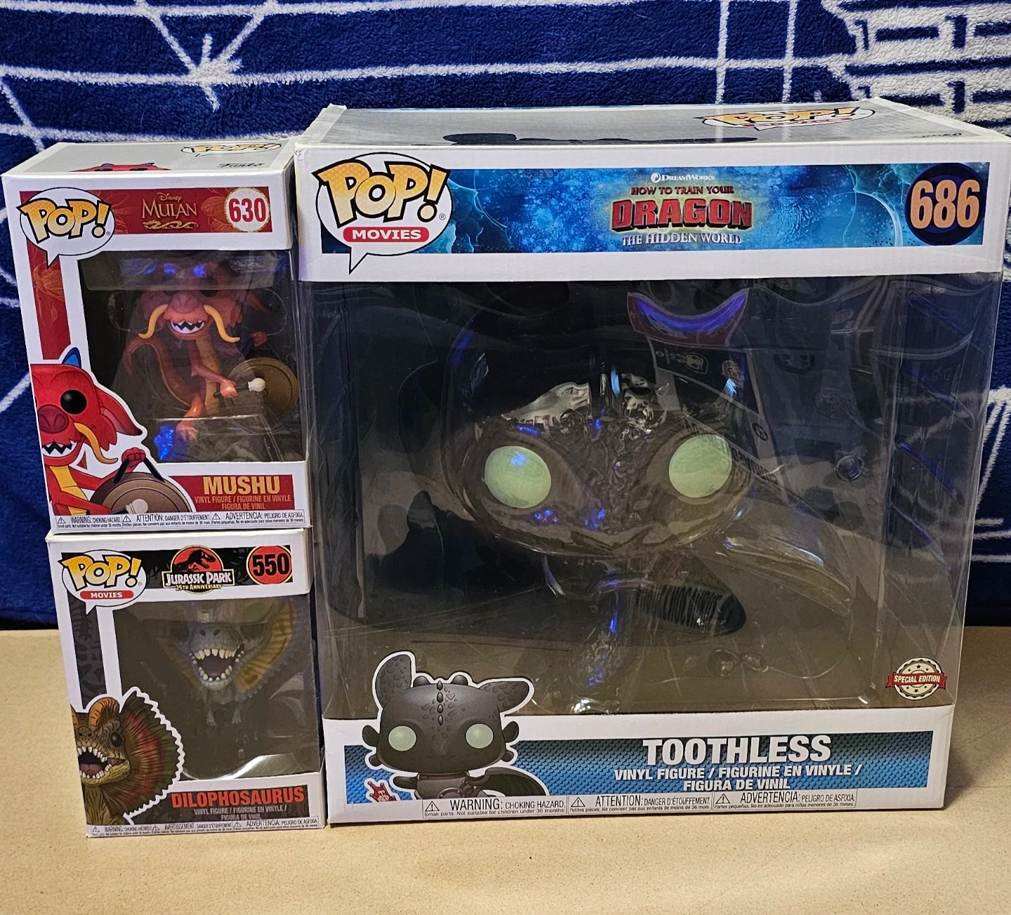 Three Funko Pop! vinyl figures from popular movies. Includes Toothless from How to Train Your Dragon, Mushu from Mulan, and Dilophosaurus from Jurassic Park. All figures are in their original boxes.