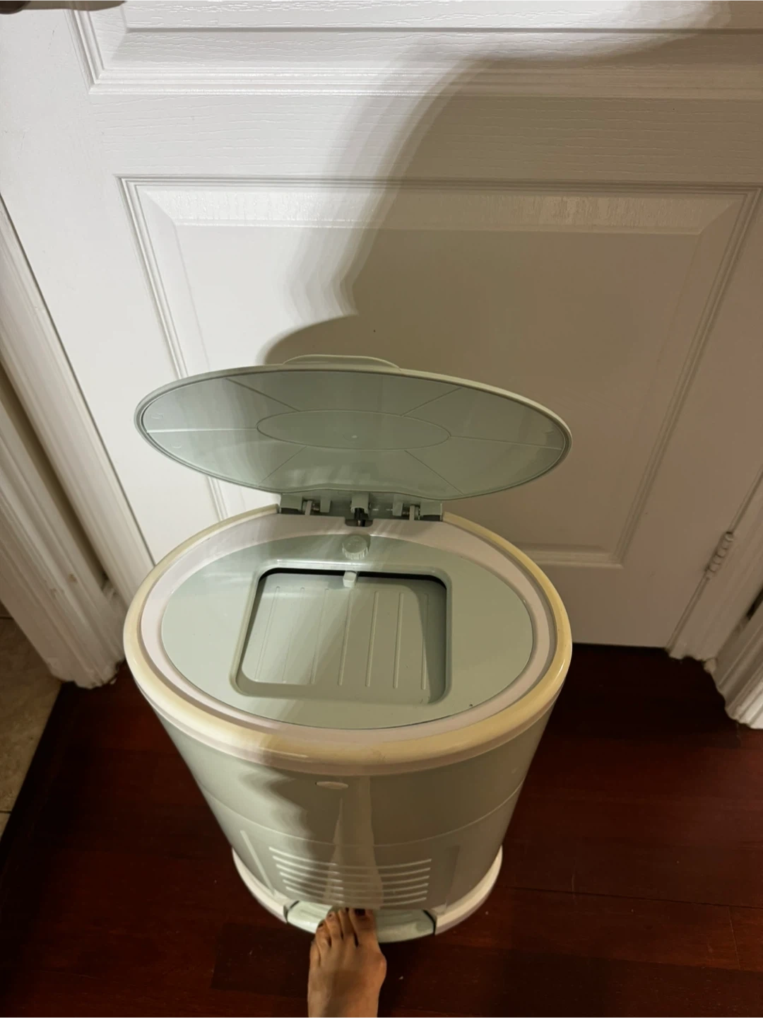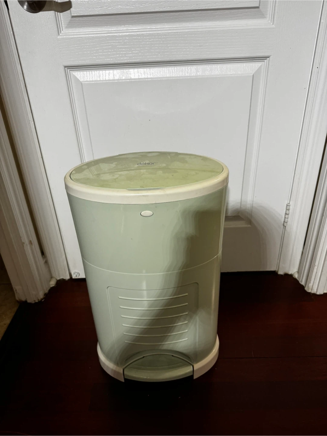 This is a Dékor diaper pail. It's a light green colour. The lid opens with a foot pedal and has a trap door inside.
