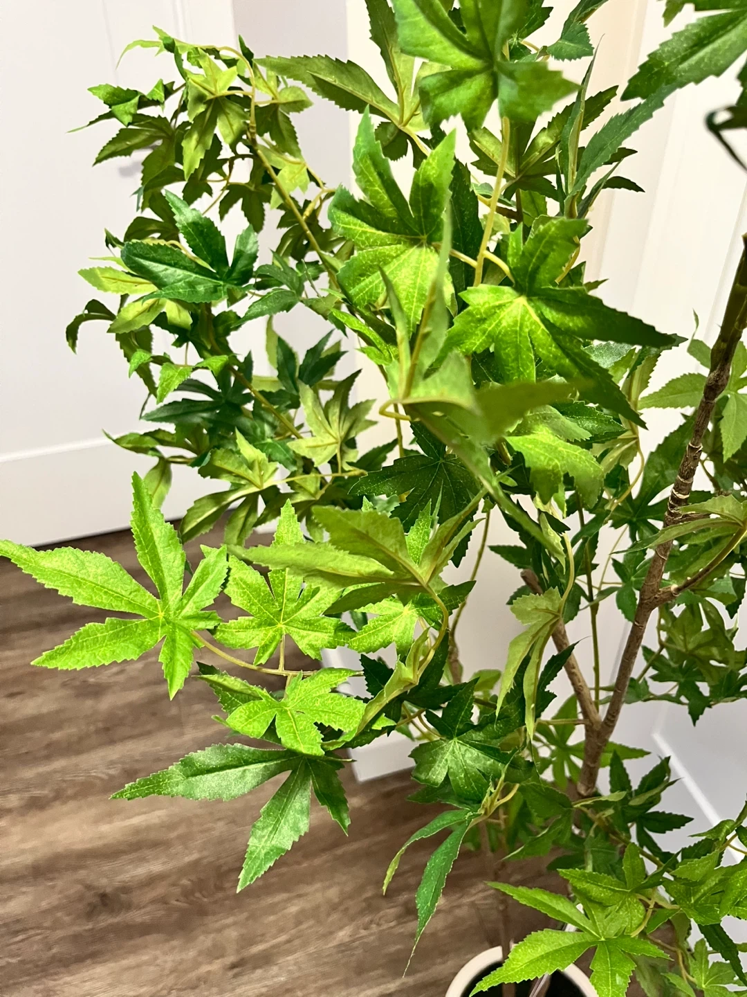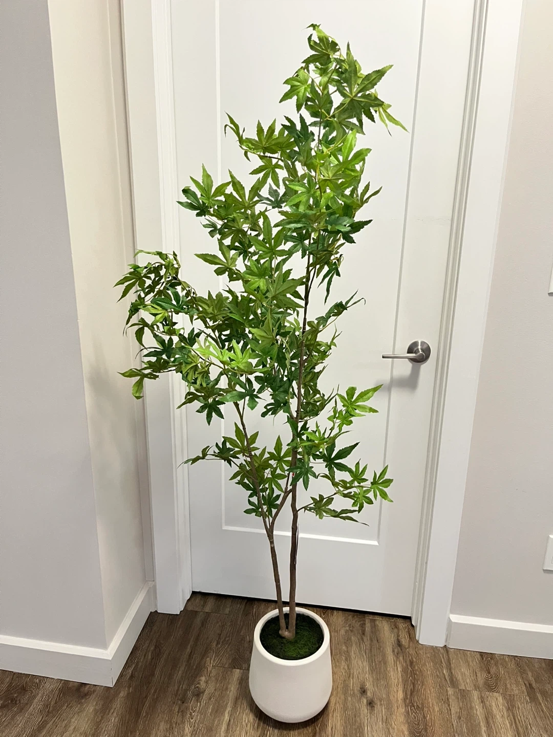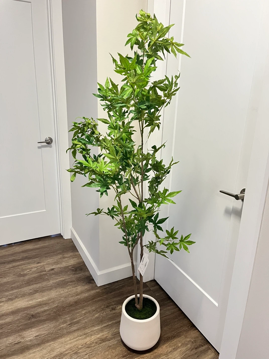 Bring some greenery indoors with this realistic artificial maple tree. It's potted in a sleek white planter, perfect for adding a touch of nature to any room. This plant doesn't require any watering or maintenance. It's great for brightening up corners or entryways.
