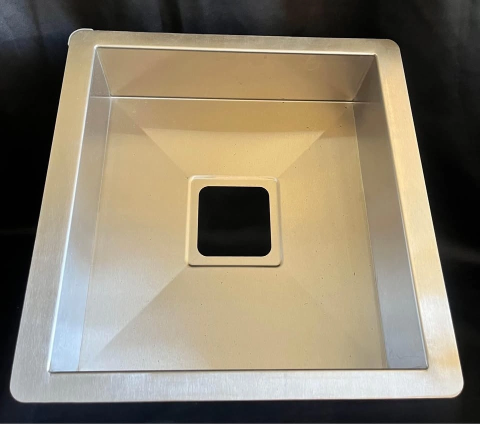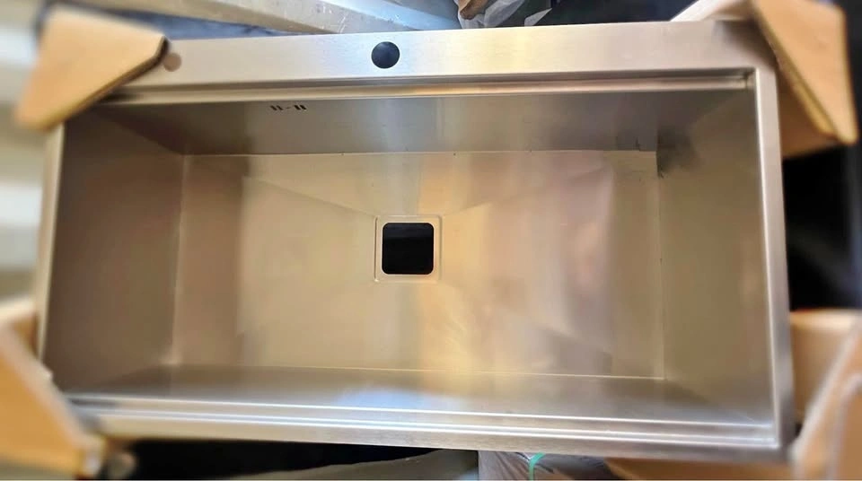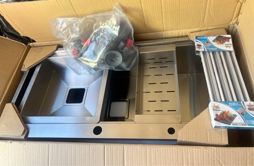 Pristine stainless steel kitchen sink with a single bowl and a hole for a faucet. Includes a roll-up dish drying rack, a slotted rack, drain assembly, and soap dispenser. Everything is still in original packaging or looks unused. Never installed.