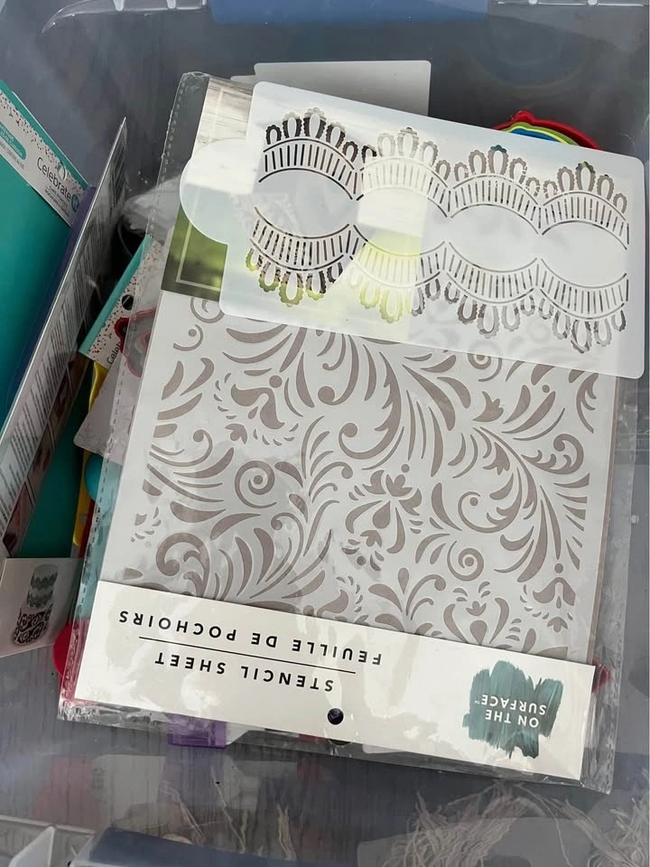 Awesome baking and crafting supplies bundle! Includes new Wilton FoodWriter food color markers, still in package. Also new Christmas cookie cutters, 3 pcs, perfect for holiday treats. Has a set of colorful 'Tasty' brand measuring cups. A new blue fondant mold with pretty swirl design, still in package. Another set of 6 cookie cutters, looks like gingerbread shapes. Plus two 'On the Surface' brand stencils, new in package, one has a lace pattern, other has a cool floral design. Some purple decorating tools too. Great for anyone into baking or crafts!