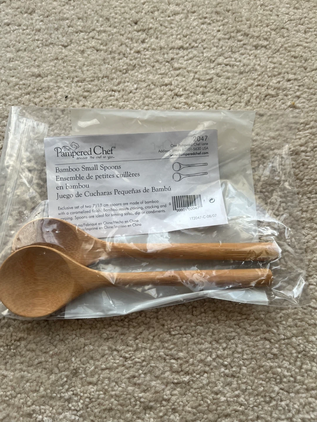 Exclusive set of two 7"/18 cm spoons made of bamboo. Bamboo resists staining, cracking and warping and has a caramelized finish. These spoons are ideal for serving salsa, dip, or condiments.