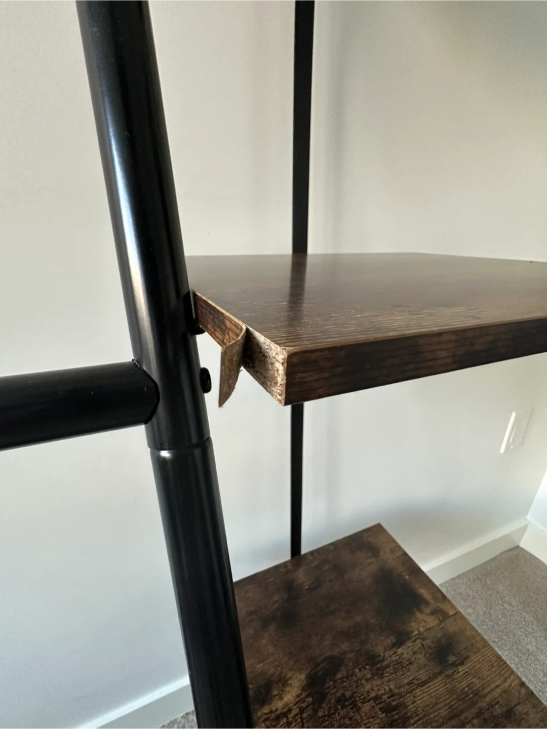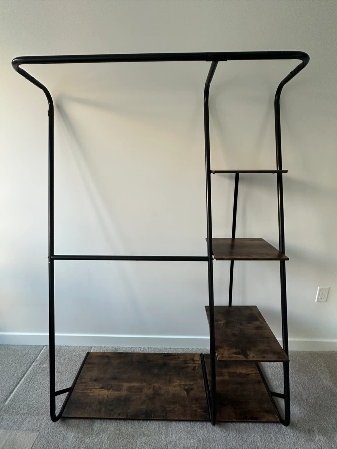 This ladder-style garment rack comes with multiple wooden shelves for storage. It features a black metal frame. Some minor damage to one of the shelf corners is visible, but nothing a little wood glue can’t fix. It's a great piece for organizing clothes and accessories! It has been dissembled for easy moving and storage.