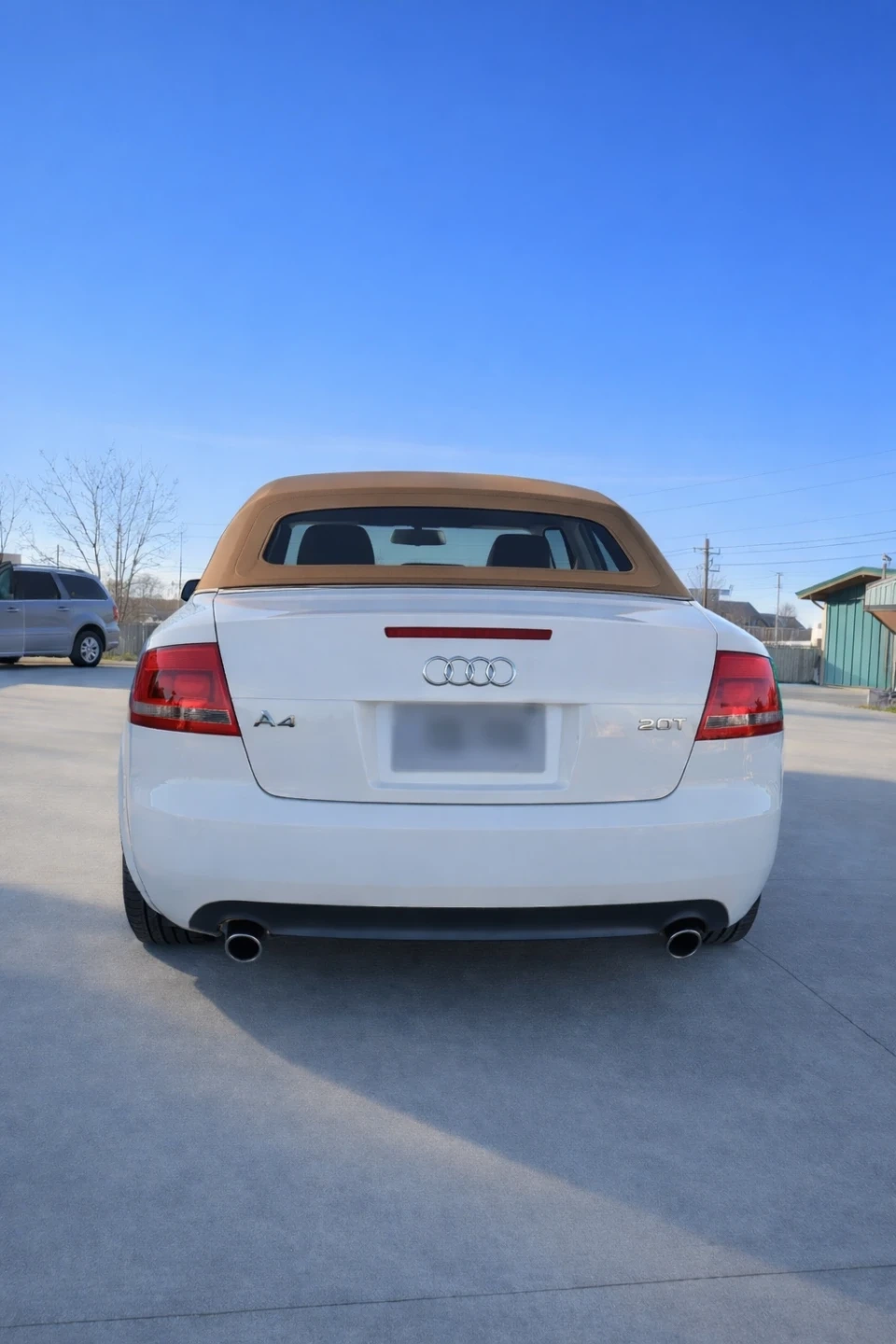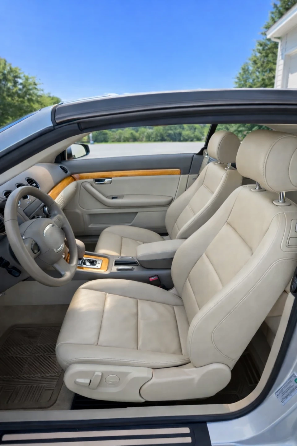 White Audi A4 convertible with a tan soft top. Tan leather interior. 2.0T engine. Ready for summer cruising! This car is being sold because owner is in hospital and is not able to drive. Contact for more information!