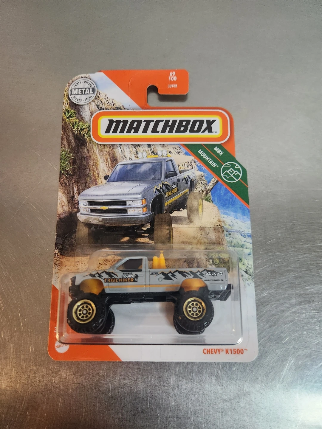 It's a Matchbox MBX "Trail Hiker" series die-cast toy truck. This model is a Chevy K1500 in a light grey colour with orange and black graphics. It's designed for off-road play with its large tires and lifted suspension.