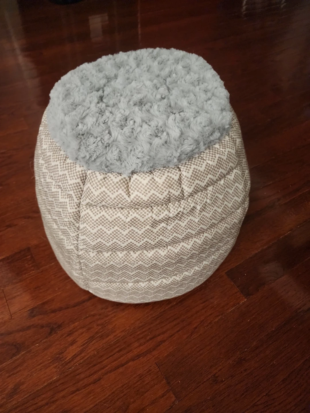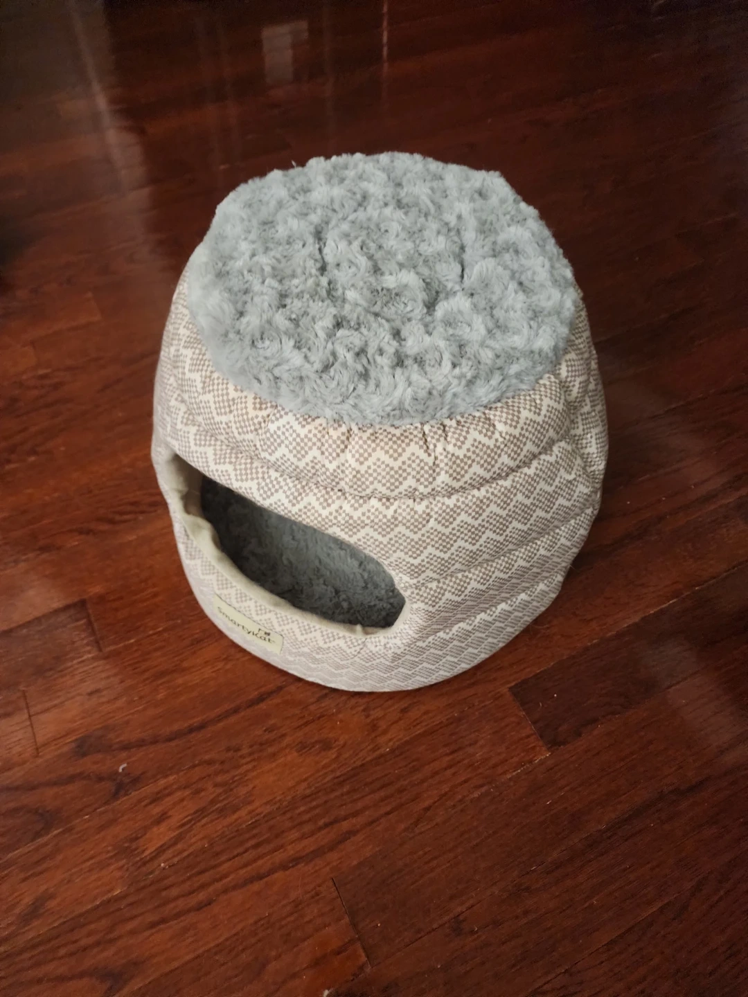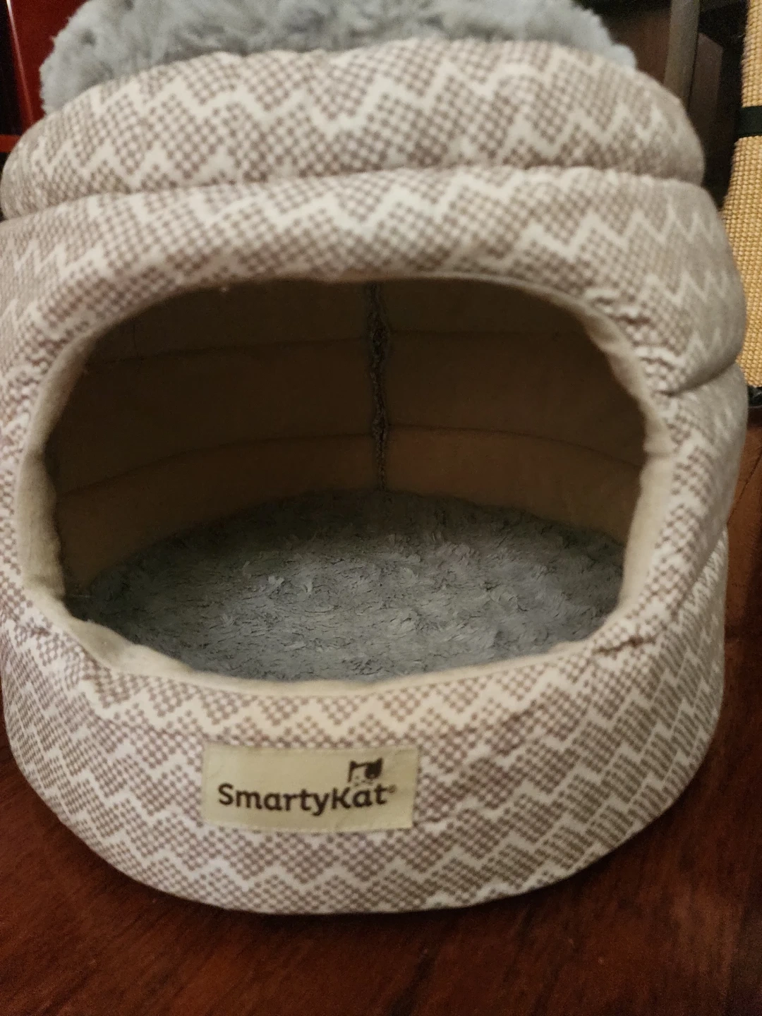 Cozy enclosed pet bed with a plush grey interior and exterior patterned fabric. It's soft and provides a comfortable spot for your furry friend. The soft grey fur on top adds extra comfort!