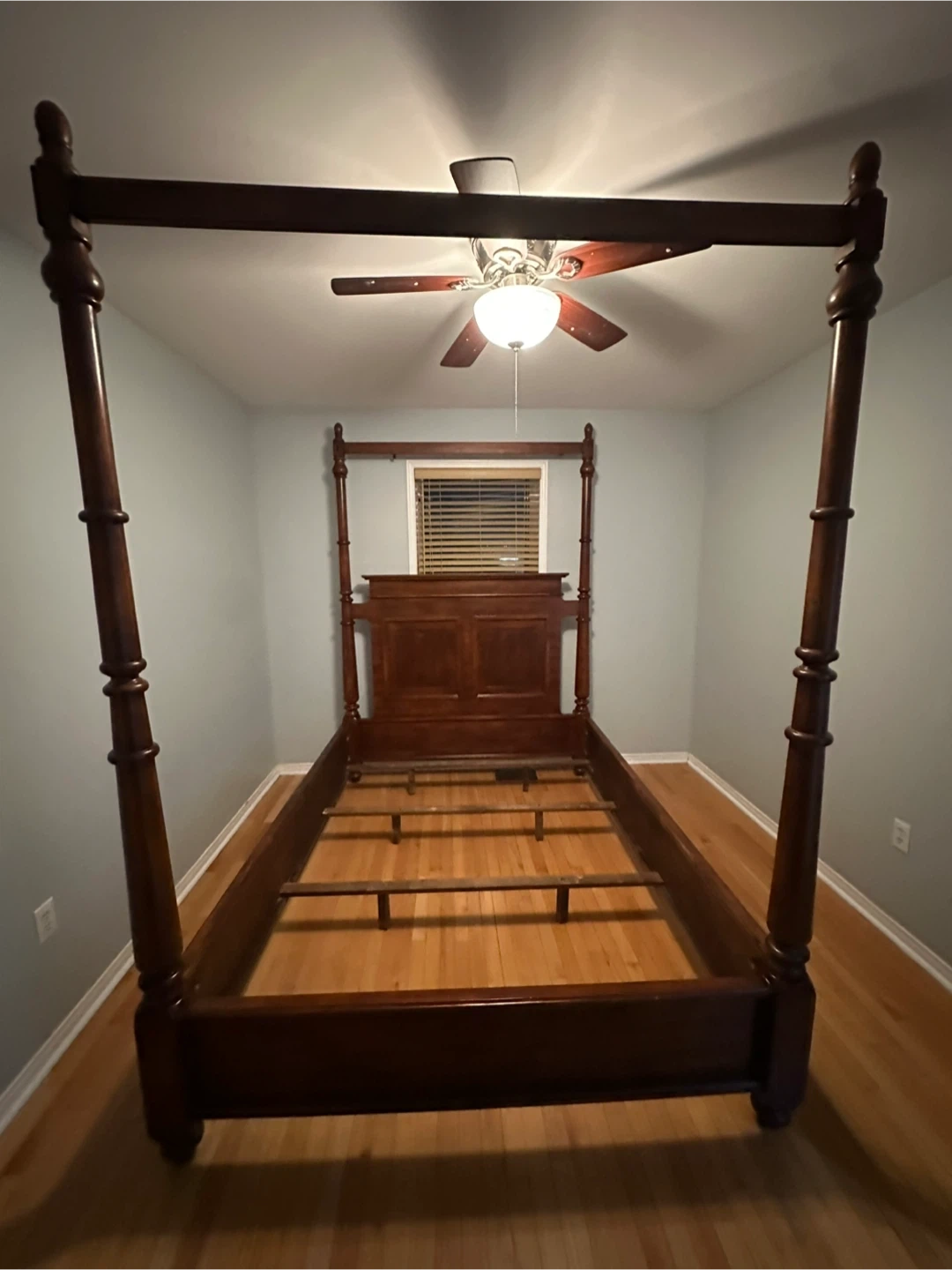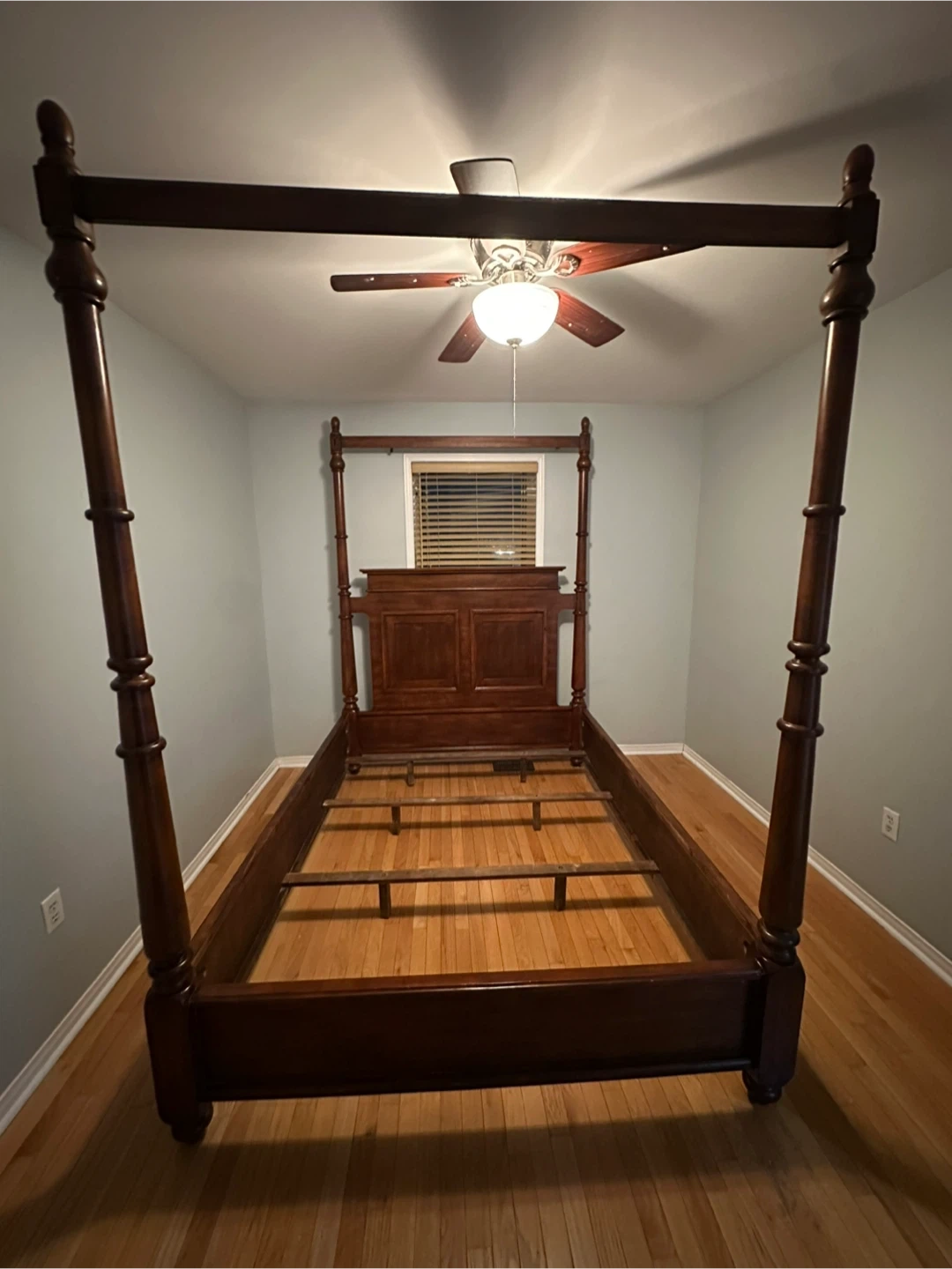 This brown wooden canopy bed frame offers a classic and elegant look for any bedroom. It's crafted from solid wood, ensuring durability and a sturdy structure. The posts and headboard feature decorative detailing, adding a touch of sophistication. This bed frame provides a solid foundation for your mattress. It's a great centrepiece for a master bedroom or guest room!